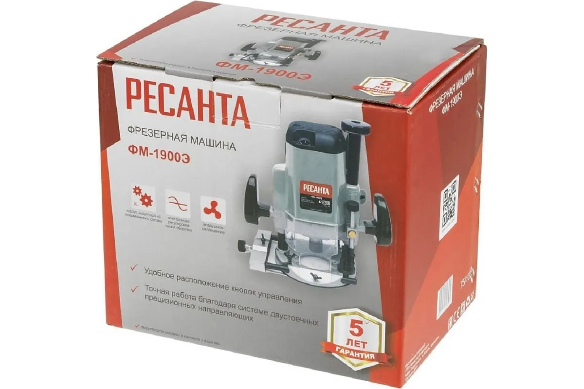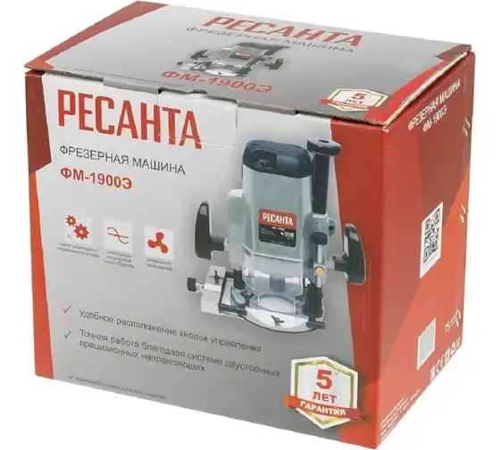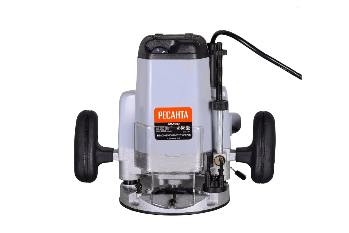 Модель фрезеровальной машины Ресанта ФМ-1900Э служит для выполнения различных операций и фигурной обработки пластмассы, древесины, стройматериалов, а также для проведения фрезеровки по шаблону. Фрезер этой модели имеет надёжную подошву, оснащённую фиксаторами, шкалу, позволяющую задавать глубину реза, систему настройки числа оборотов и специальный упор, обеспечивающий точное движение инструмента на заранее заданном расстоянии вдоль края обрабатываемой детали.