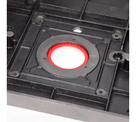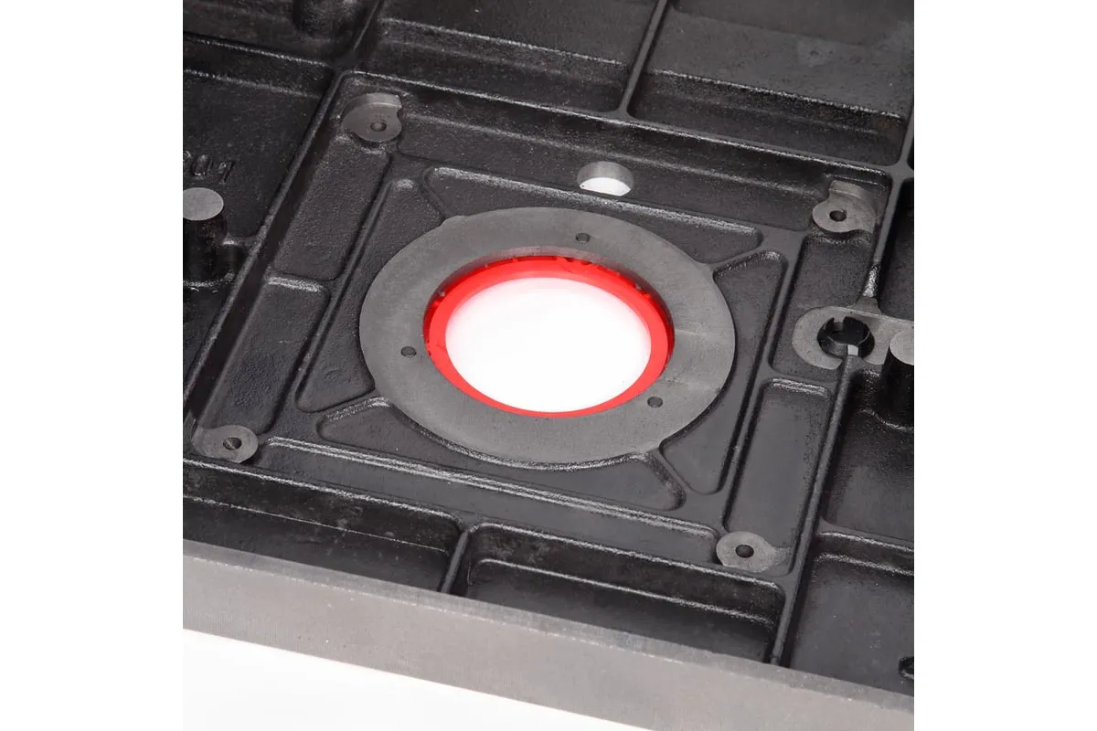 Имеется два отверстия для регулировки высоты вылета фрезы: первое - общего плана под пластину №1, второе - под пластину для лифта BELMASH D033A. Основной и дополнительные столы имеют паз под установку углового упора (-60.+60 град.).