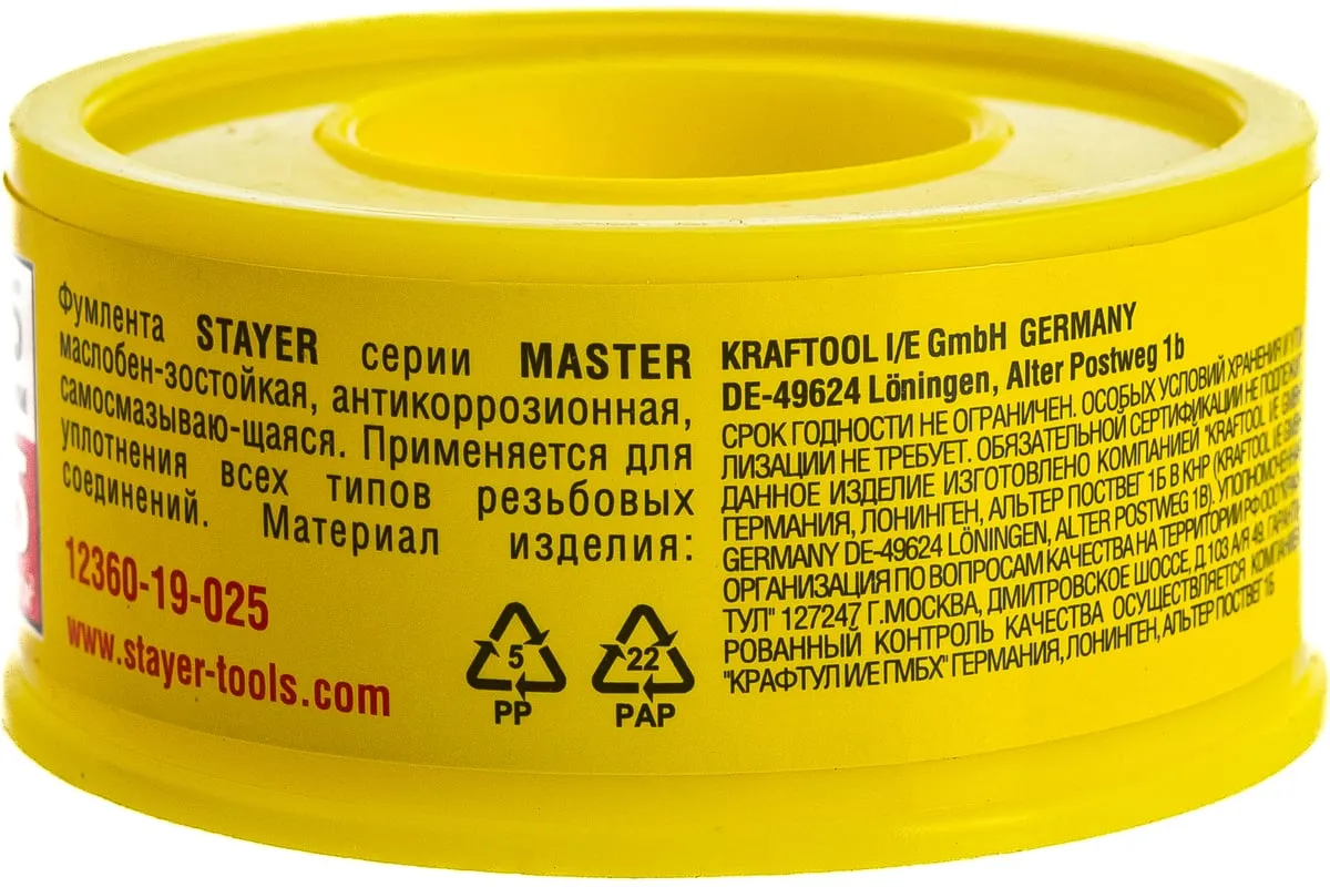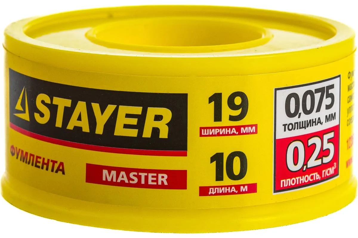 Фумлента "MASTER" Stayer 12360-19-025 используется в качестве уплотнителя при соединении водопроводных труб, любых резьбовых соединений, а также ремонте различной техники. Лента произведена из политетрафторэтилена (PTFE), что гарантирует ее высокую прочность и стойкость к кислотным и щелочным веществам. Можно применять при температуре от -60 до +2000С.Характеристики:
