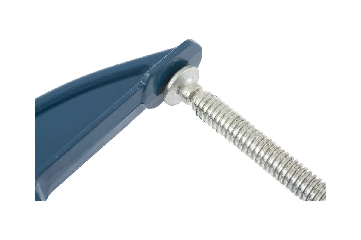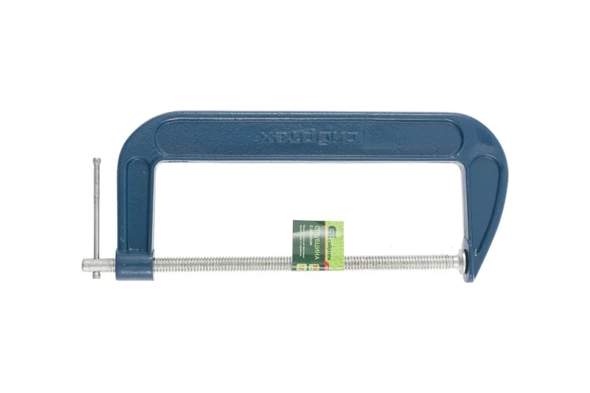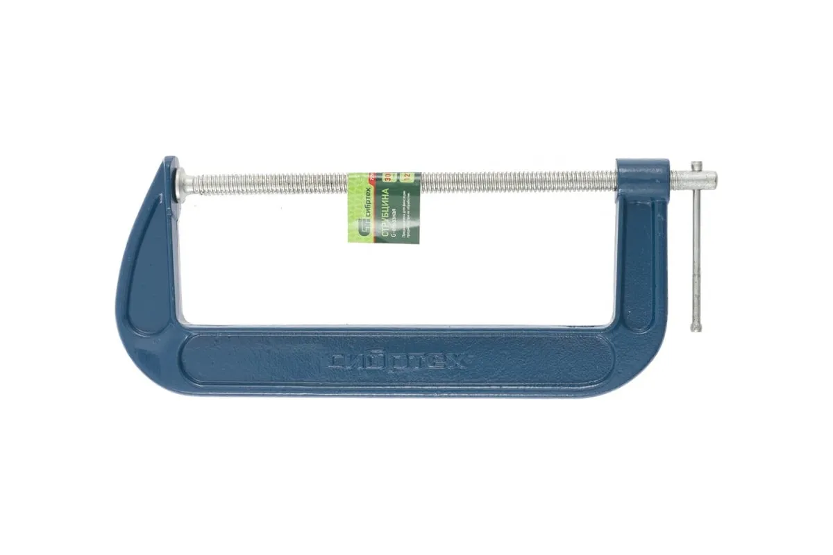 G-образная струбцина СИБРТЕХ 300 мм 20592 представляет собой зажимной инструмент, который используется при склейке деталей. Изделие обладает прочным чугунным корпусом с покрытием из порошковой эмали. Специальный зажим свободно вращается на шаровом шарнире резьбового штока, выполненого из стали марки ст3 и оцинкованного для защиты от коррозии.