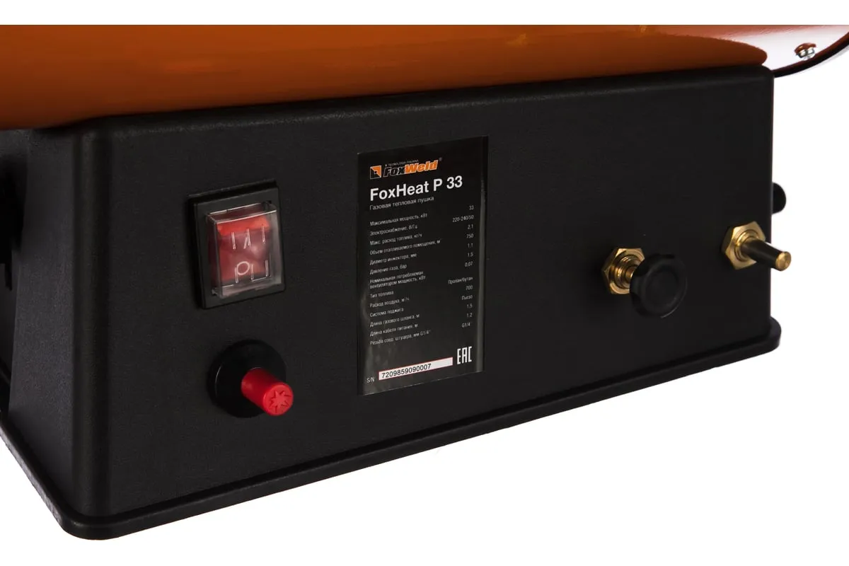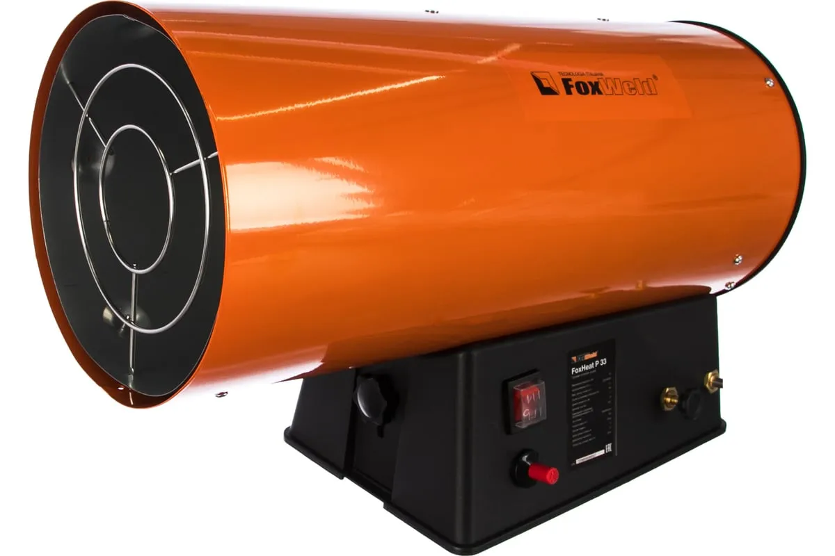 Газовая тепловая пушка FOXWELD FoxHeat P 33 7209 эффективно обогревает помещения до 750 куб.см. Газовый шланг подключается с помощью соединительного штуцера 1/4". Давление газа 0.7 бар.