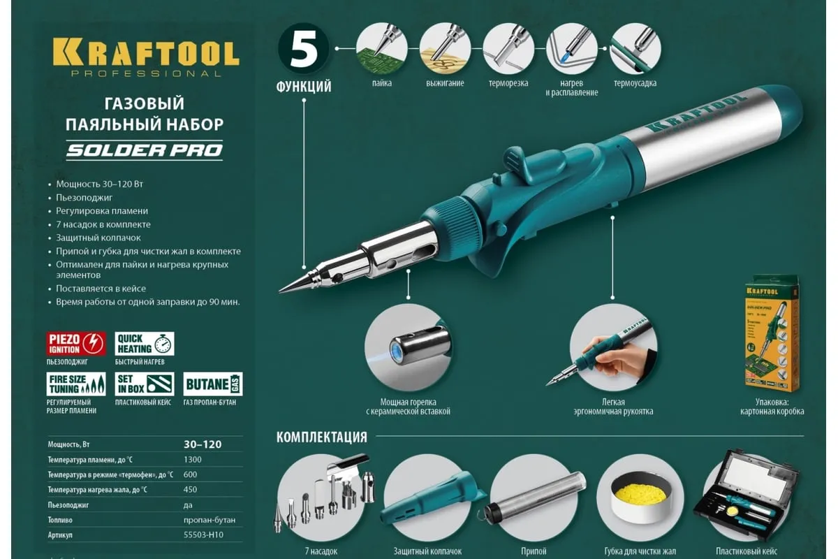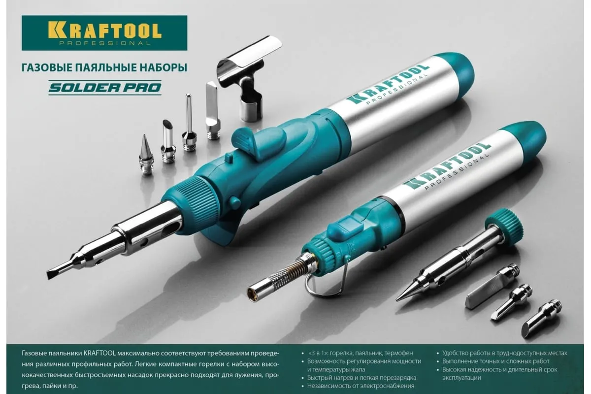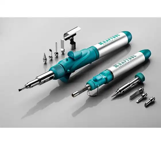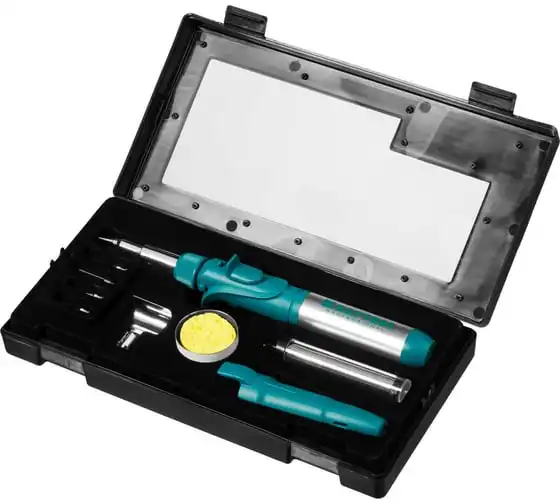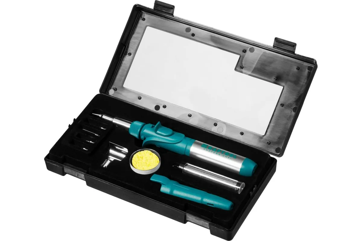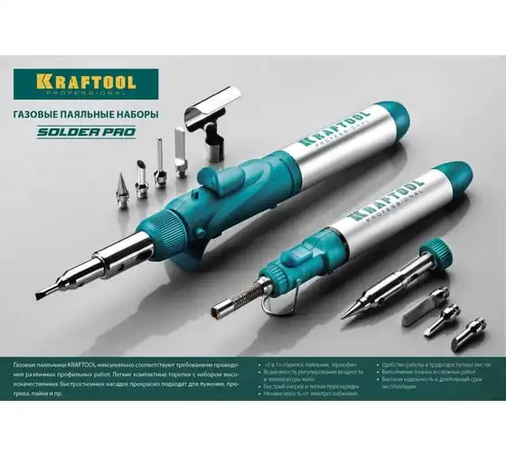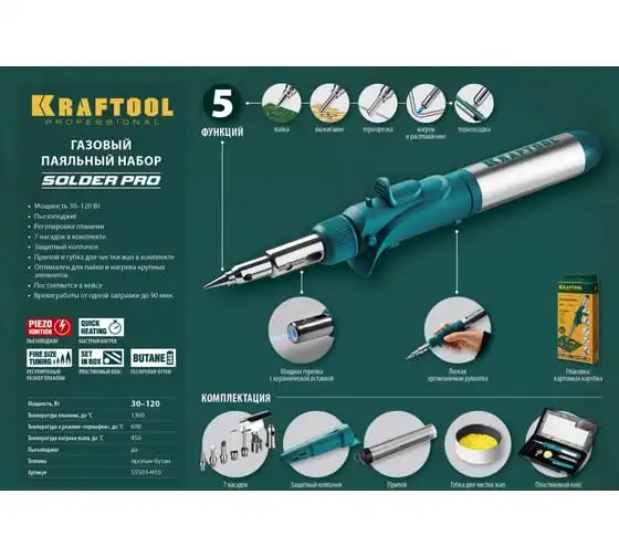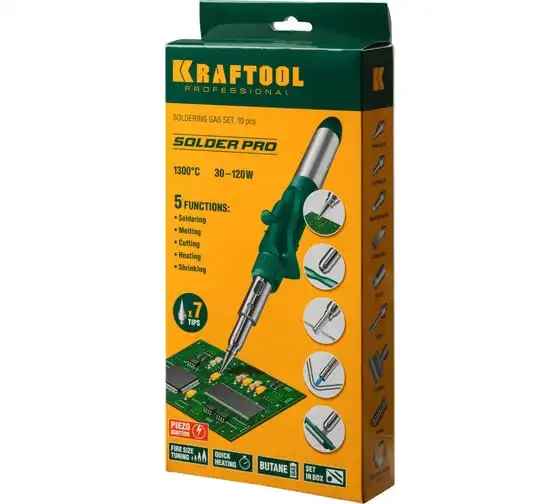 Газовый паяльник KRAFTOOL SolderPro набор 10-в-1 55503-H10 предназначен для плавки и сварки пластиковых частей, нагрева малых металлических частей и плавки металла с низкой температурой плавления, ремонта ювелирных изделий, сгибания тонких стеклянных трубок, пайки медных трубок, сварки электронных и электротехнических элементов. Беспроводной паяльник поставляется с 5-ю сменными насадками. Он обладает возможностью выбора температурного режима, что позволяет максимально соответствовать требованиям любой работы. Этот легкий в обращении инструмент, идеально подходит для пайки, выжигания, резки и многих других работ.