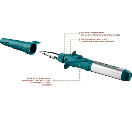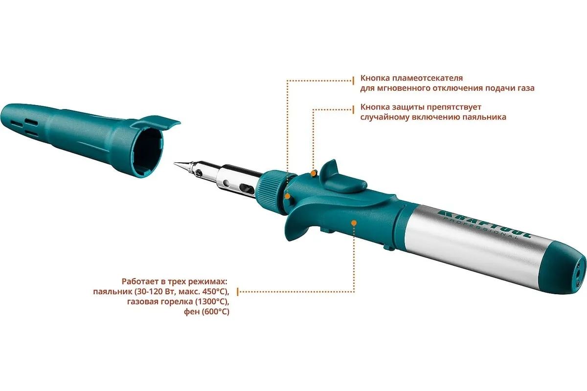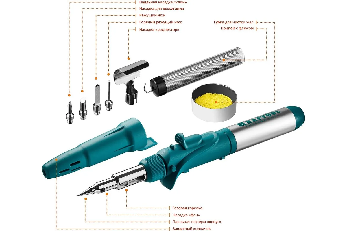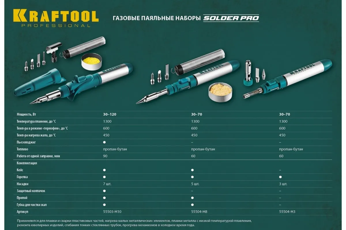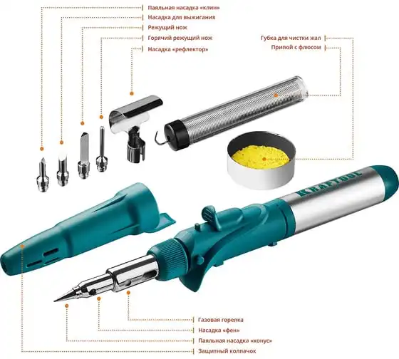 Газовый паяльник KRAFTOOL SolderPro набор 10-в-1 55503-H10 предназначен для плавки и сварки пластиковых частей, нагрева малых металлических частей и плавки металла с низкой температурой плавления, ремонта ювелирных изделий, сгибания тонких стеклянных трубок, пайки медных трубок, сварки электронных и электротехнических элементов. Беспроводной паяльник поставляется с 5-ю сменными насадками. Он обладает возможностью выбора температурного режима, что позволяет максимально соответствовать требованиям любой работы. Этот легкий в обращении инструмент, идеально подходит для пайки, выжигания, резки и многих других работ.