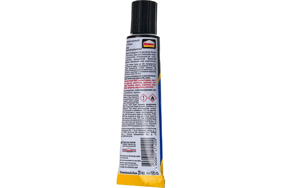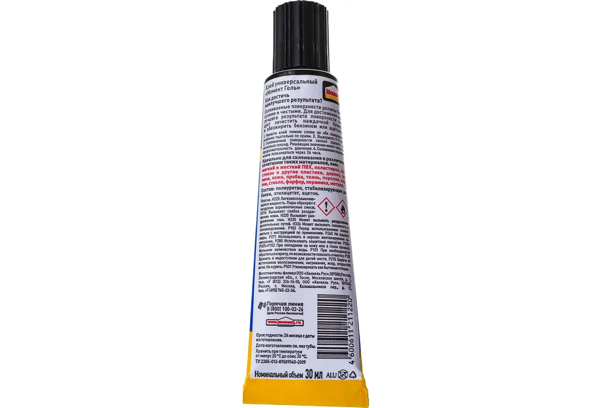 ГЕЛЬ Момент подходит для склеивания как мягкого, так и жесткого ПВХ, полистирола, оргстекла и других пластиков, а также дерева, резины, кожи, пробки, ткани, поролона, бумаги, картона, стекла, фарфора, керамики, вспененных материалов, металлов и других. Обладает высокой устойчивостью к воздействию разбавленных кислот и щелочей. Не растекается и не капает даже при нанесении на вертикальные поверхности. Не рекомендуется применять для склеивания посуды, контактирующей с пищей, стиропора, полиэтилена и полипропилена. Срок годности — 24 месяца.