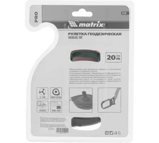 Геодезическая рулетка MATRIX 20 м х 15 мм 31270 широко используется в строительстве и при ремонтных работах. Имеет прочный корпус с обрезиненной поверхностью, удобно лежит в руке и не выскальзывает в процессе измерительных операций. Планетарный механизм обеспечивает быстрое сматывания мерной ленты.
