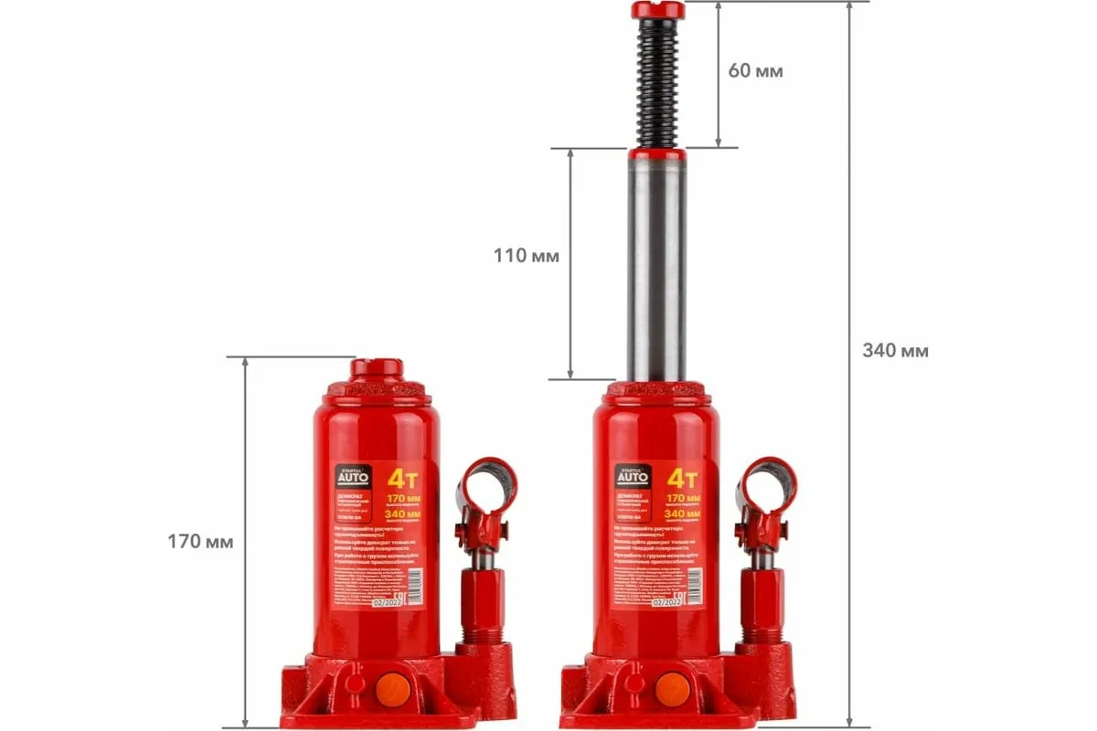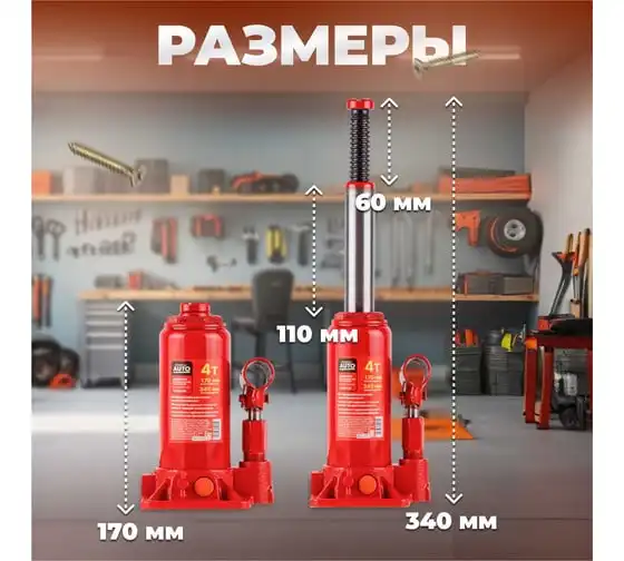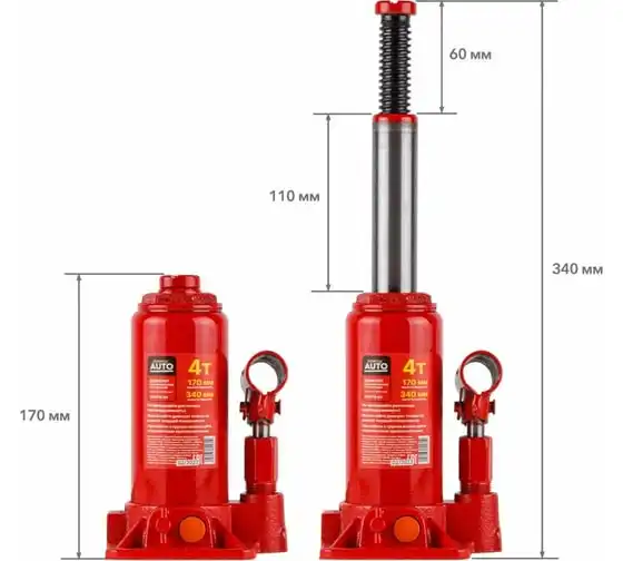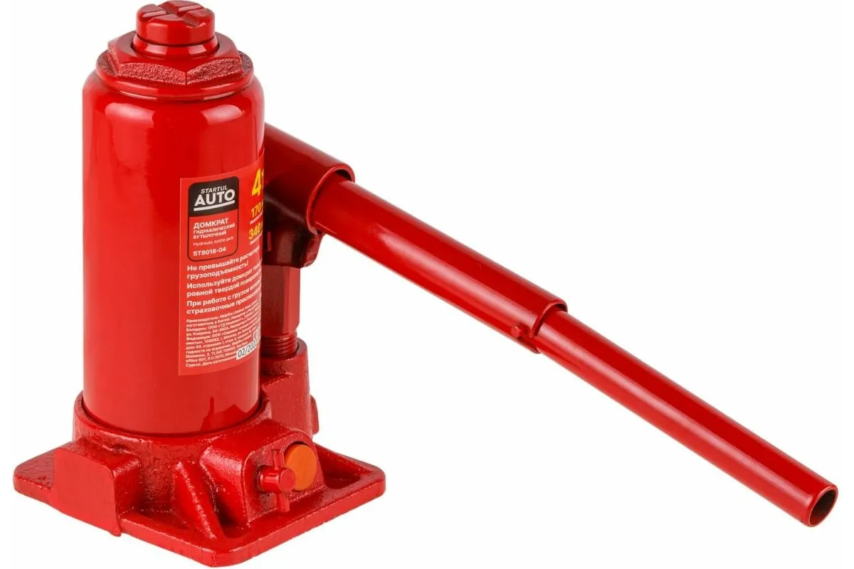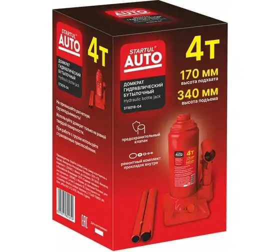 Гидравлический бутылочный домкрат STARTUL Auto 4 т ST8018-04 представляет собой устройство с ручным приводом, предназначенное для поднятия и фиксации грузов. Домкраты данного типа могут использоваться в качестве рабочего элемента в более сложных устройствах, таких как прессы, трубогибы, подъемники. Домкраты оснащены специальным предохранительным клапаном, обеспечивающим защиту от перегрузки и не позволяющим поднятия веса более допустимого.