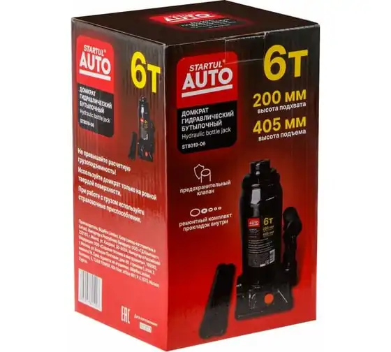 Гидравлический бутылочный домкрат STARTUL Auto 6 т ST8019-06 представляет собой устройство с ручным приводом, предназначенное для поднятия и фиксации грузов. Домкраты данного типа могут использоваться в качестве рабочего элемента в более сложных устройствах, таких как прессы, трубогибы, подъемники. Домкраты оснащены специальным предохранительным клапаном, обеспечивающим защиту от перегрузки и не позволяющим поднятия веса более допустимого.
