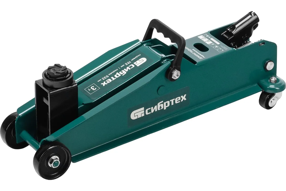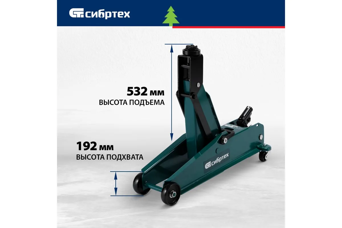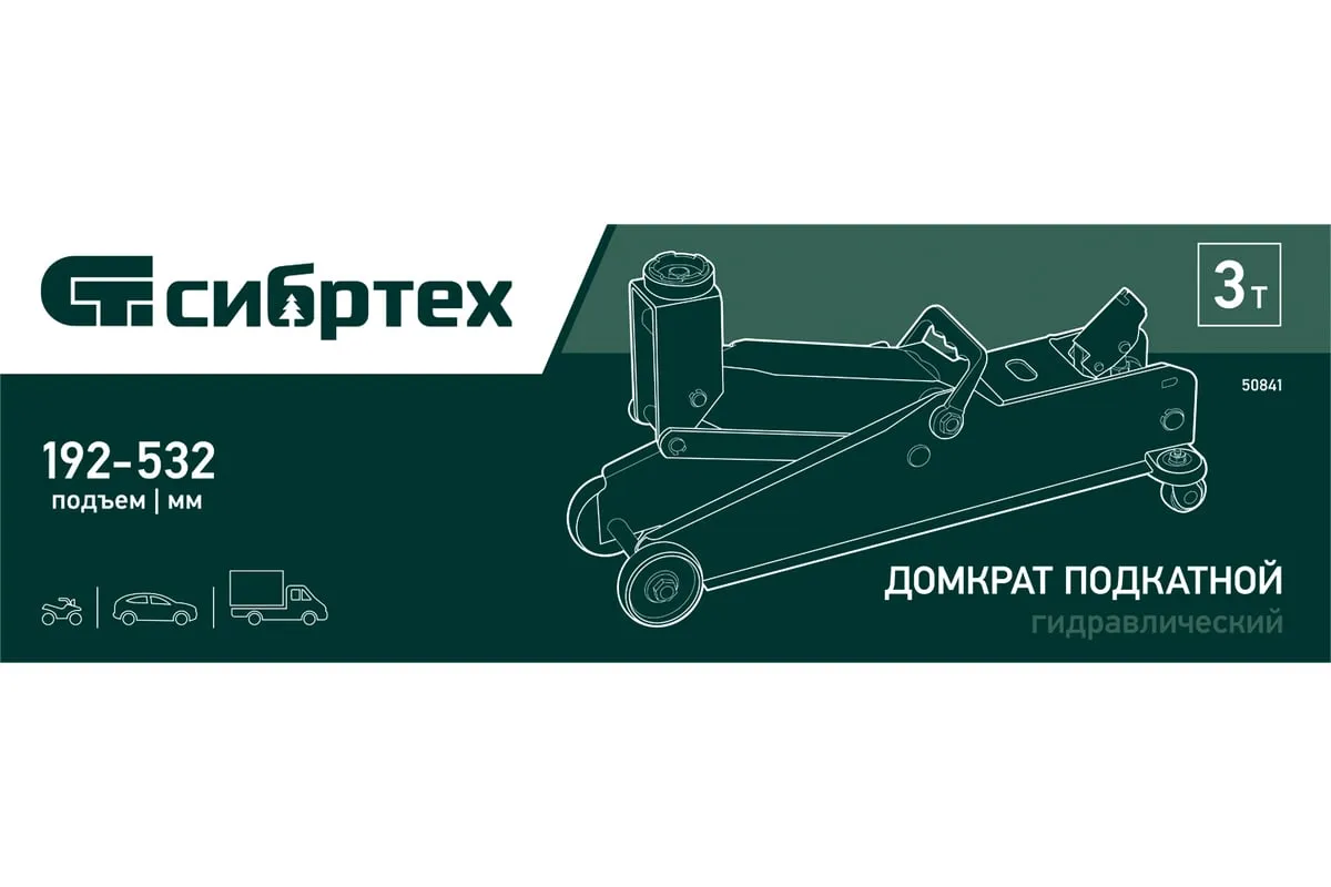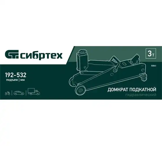 Гидравлический подкатной домкрат Сибртех 50841 с высотой подхвата 192 мм, предназначен для подъема грузов массой до 3 т на высоту до 532 мм, подходит для автомобилей со стандартным клиренсом и SUV. Компактный домкрат подходит для самостоятельного использования автовладельцами.