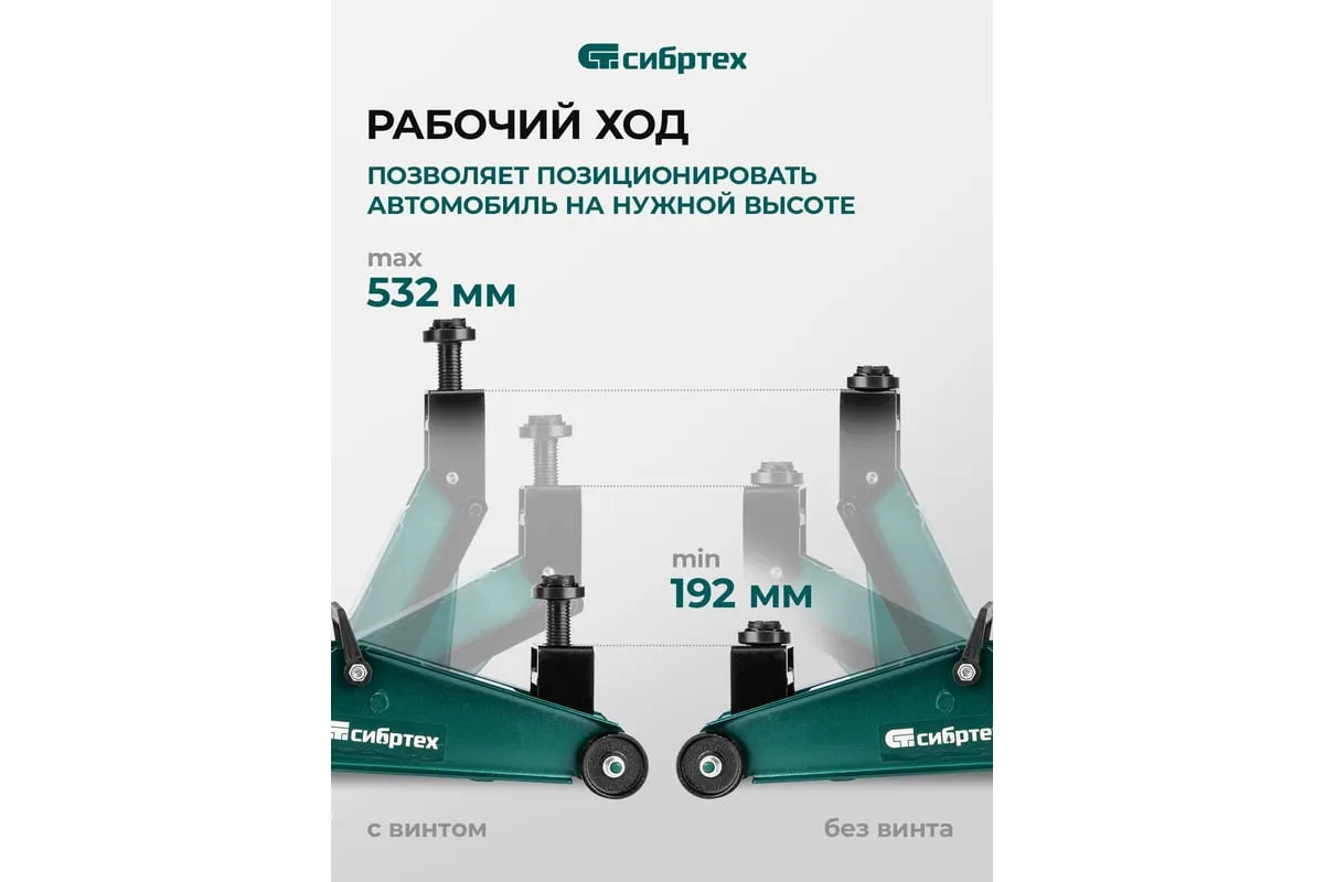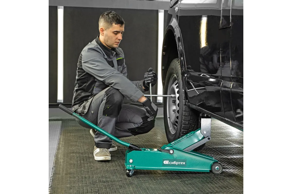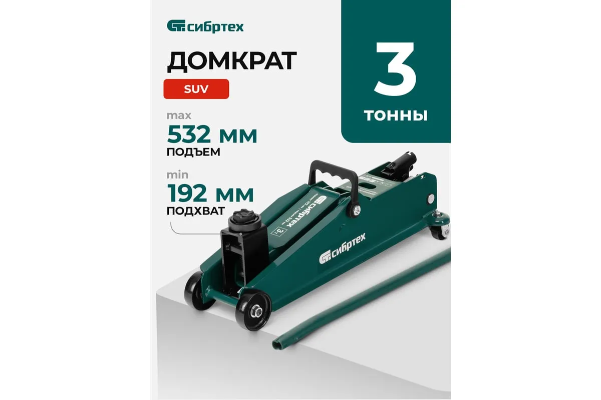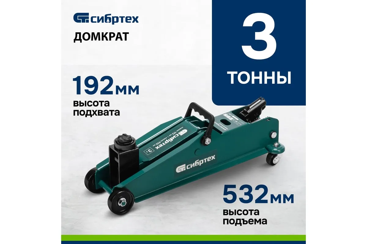 Гидравлический подкатной домкрат Сибртех 50841 с высотой подхвата 192 мм, предназначен для подъема грузов массой до 3 т на высоту до 532 мм, подходит для автомобилей со стандартным клиренсом и SUV. Компактный домкрат подходит для самостоятельного использования автовладельцами.
