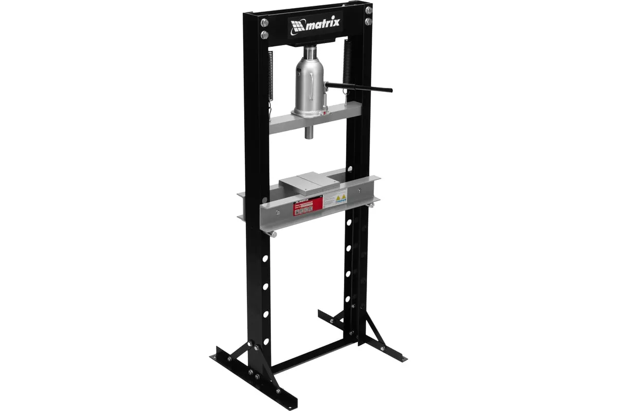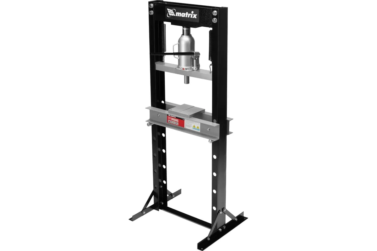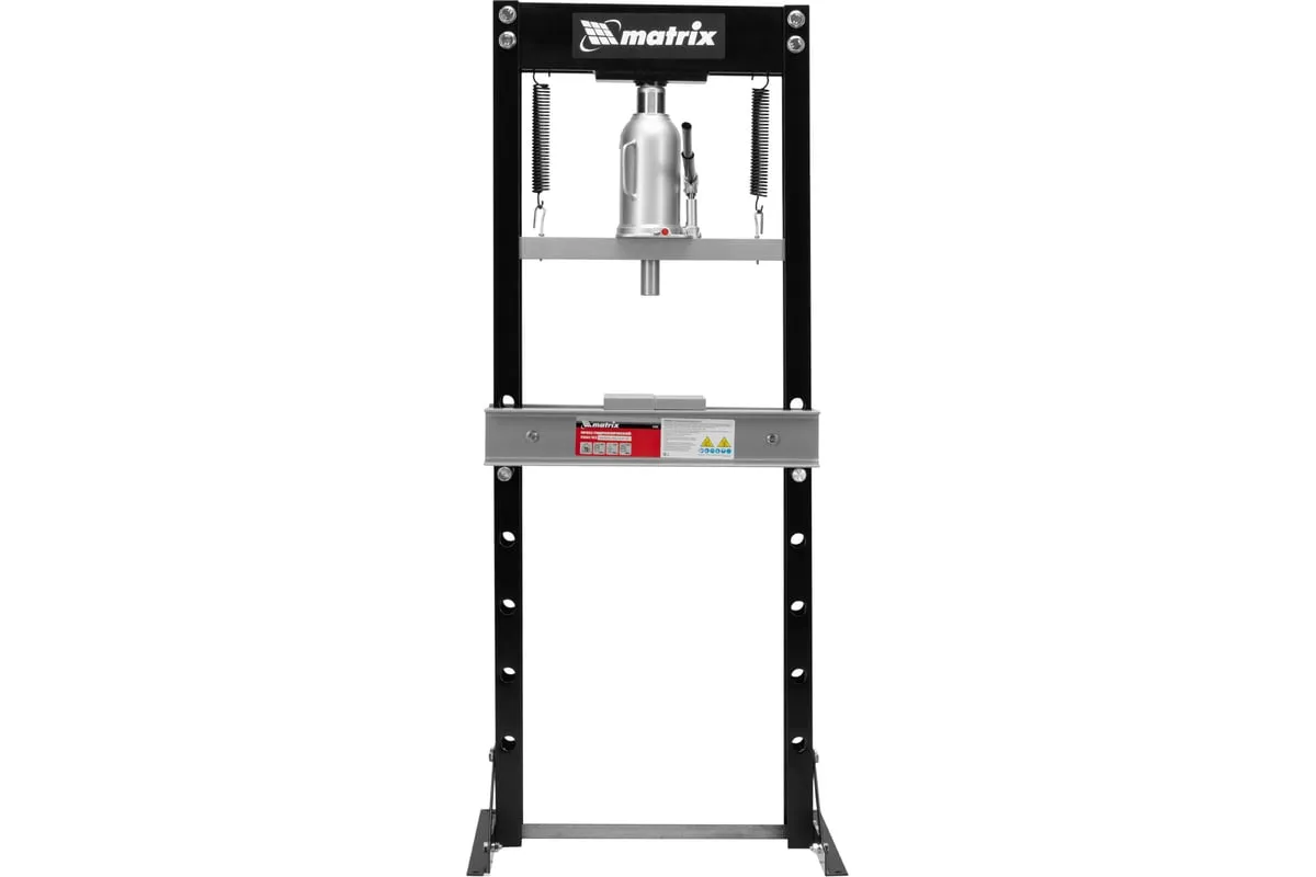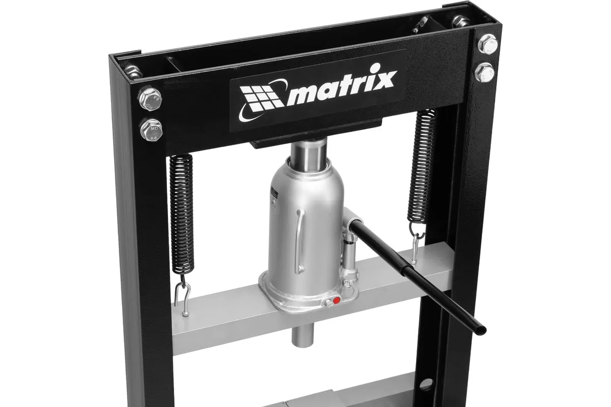 Гидравлический пресс Matrix 523205 размером 640 х 540 х 1500 мм, воздействующий на детали с усилием 20 т, поставляется комплектом из 2 частей. Его используют для запрессовки и выпрессовки различных деталей, необходимых для ремонта автомобилей. Изготовлен из толстого прочного металла и имеет простую разборную конструкцию из верхней и нижней балок, стоек, станин и гидравлического бутылочного домкрата. Пресс подойдет для самостоятельного использования в гараже.