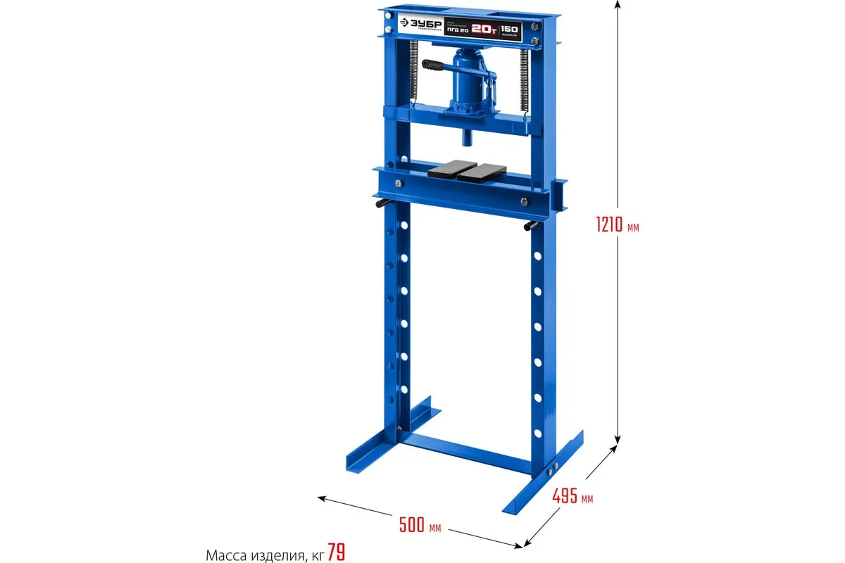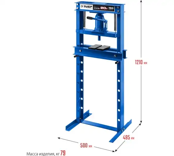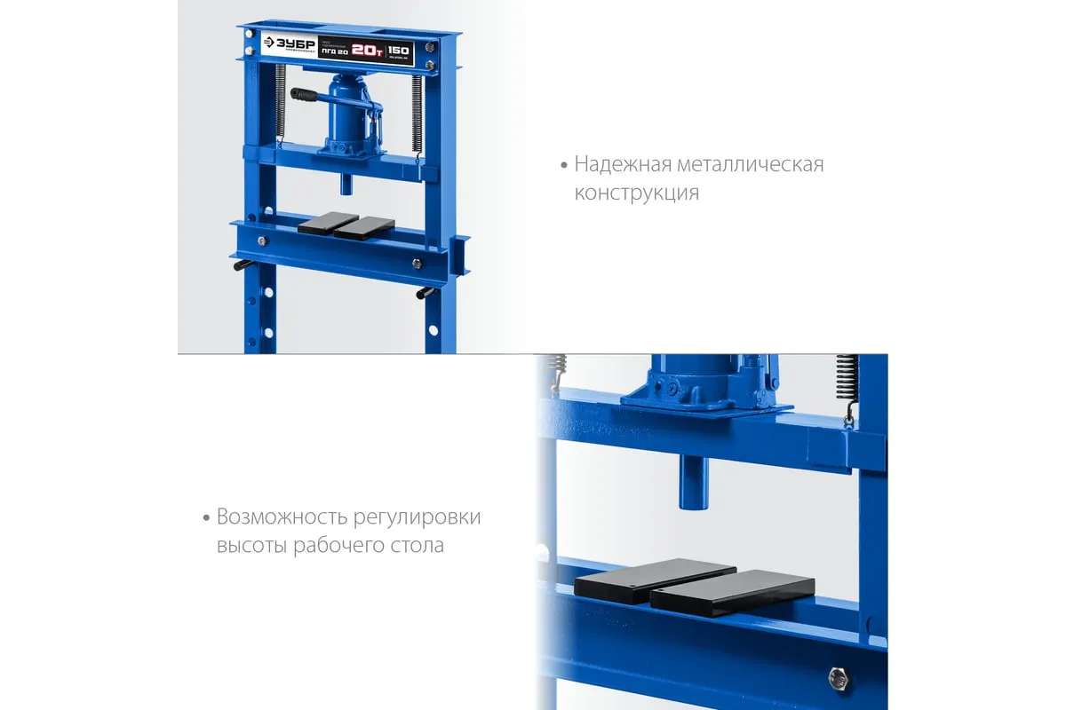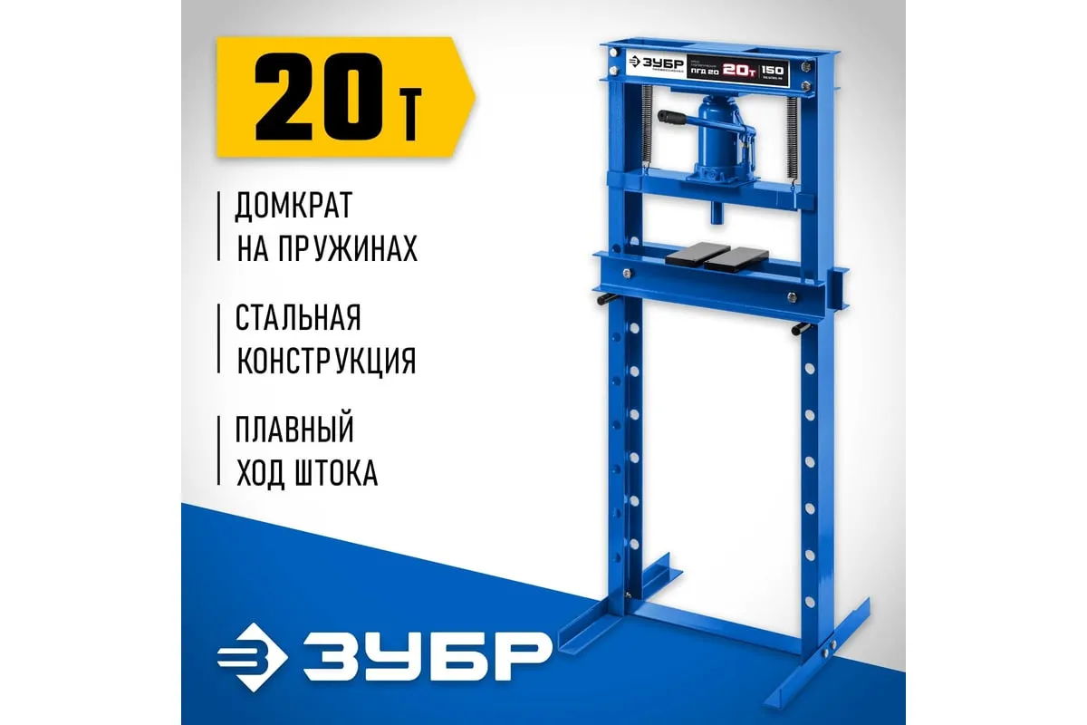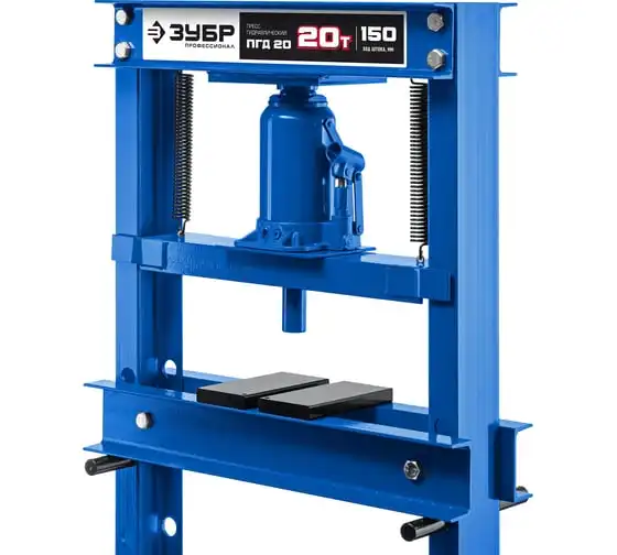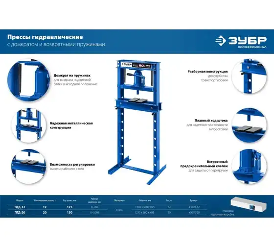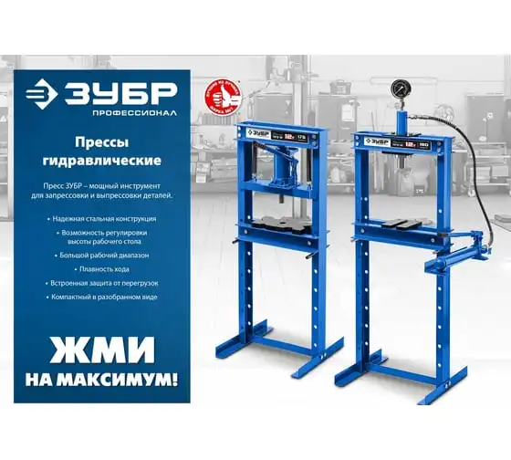 Гидравлический пресс ЗУБР предназначен для сжатия и изгиба материалов, запрессовки и выпрессовки подшипников и других слесарных работ. Пресс имеет возможность регулирования высоты рабочего пространства посредством перемещения станины. Силовым устройством данных прессов является домкрат, что обеспечивает низкую стоимость и высокую ремонтопригодность изделия. Домкрат оснащен клапаном, предохраняющим от перегрузок.