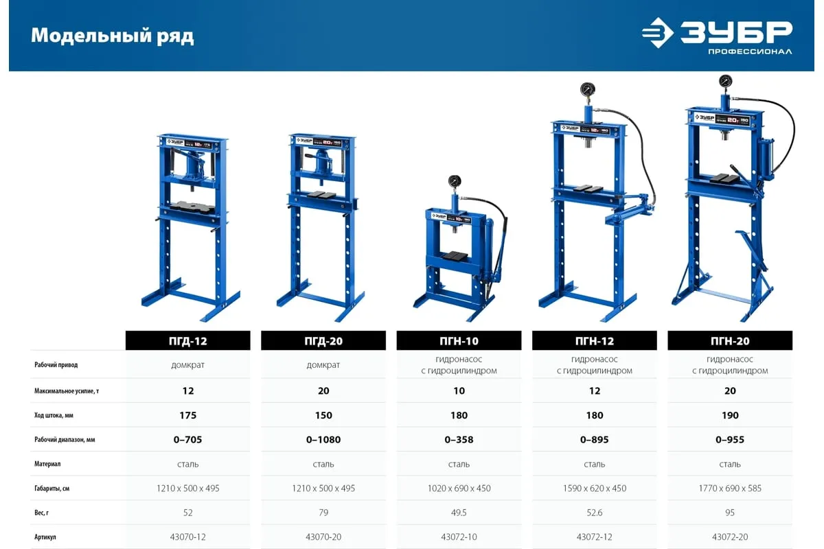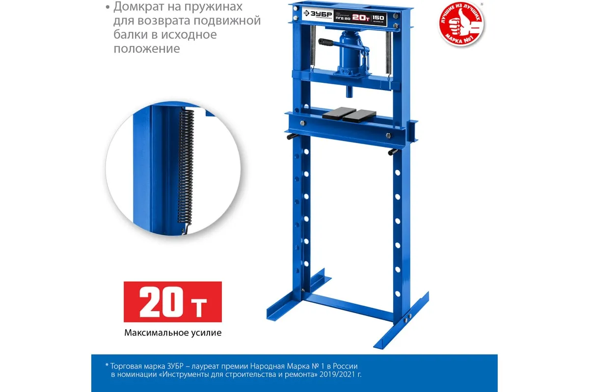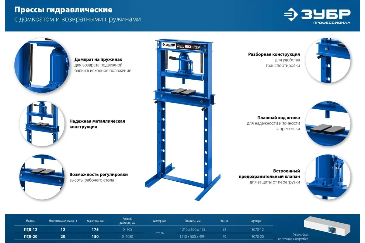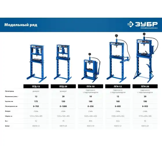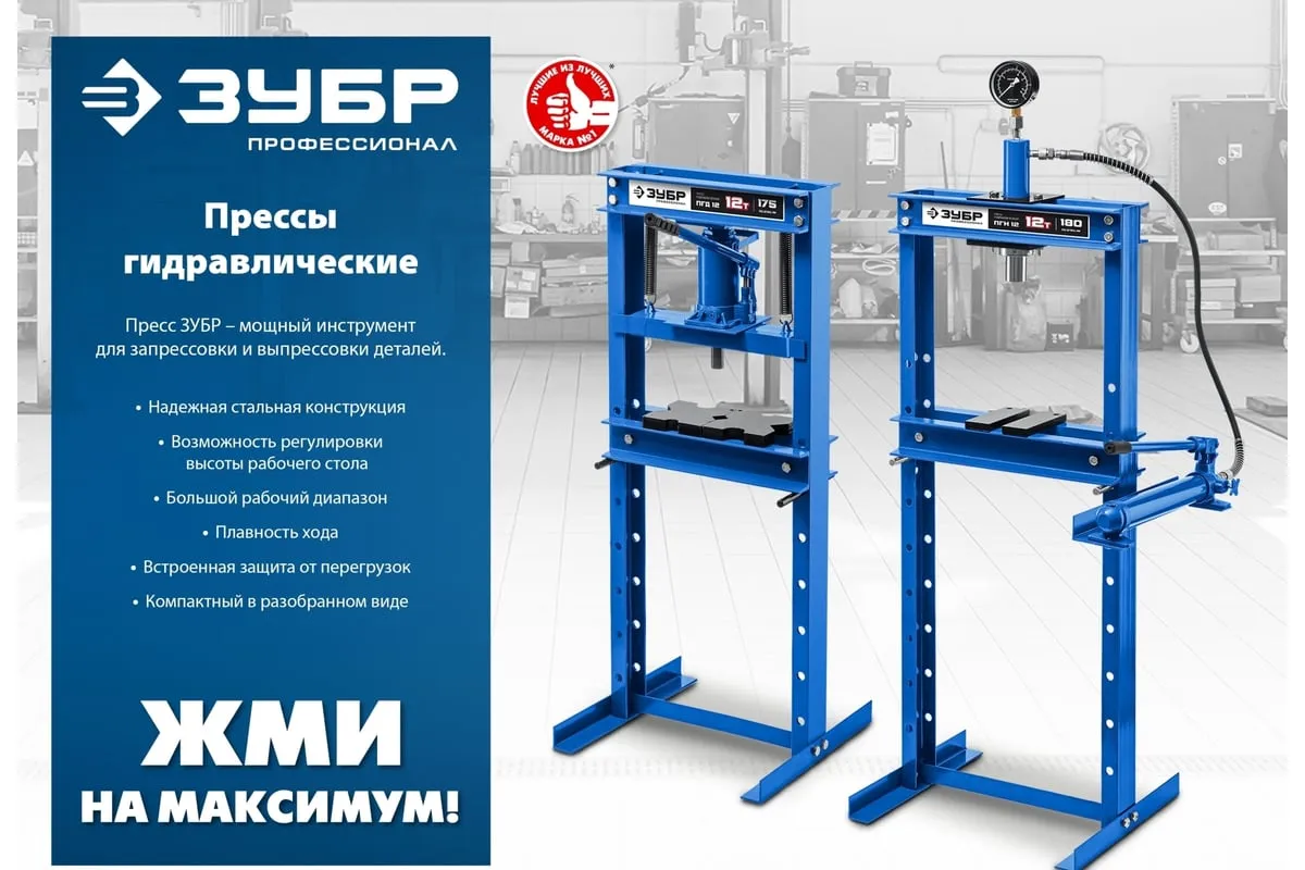 Гидравлический пресс ЗУБР предназначен для сжатия и изгиба материалов, запрессовки и выпрессовки подшипников и других слесарных работ. Пресс имеет возможность регулирования высоты рабочего пространства посредством перемещения станины. Силовым устройством данных прессов является домкрат, что обеспечивает низкую стоимость и высокую ремонтопригодность изделия. Домкрат оснащен клапаном, предохраняющим от перегрузок.