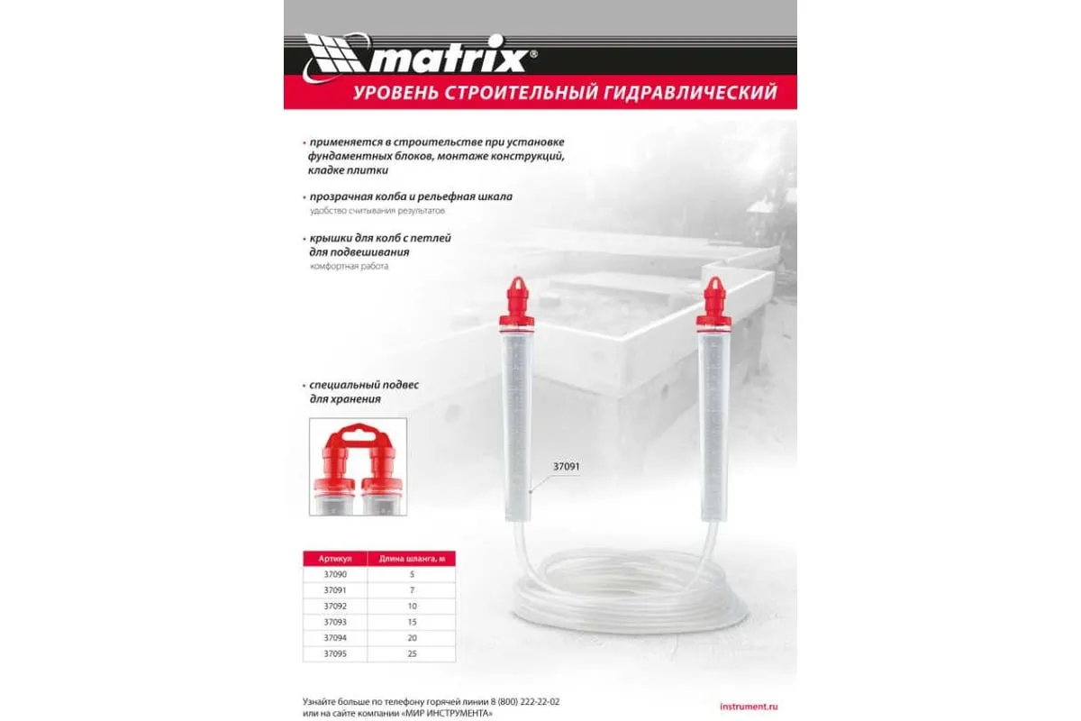 Гидроуровень Matrix 37090 с удлиненными колбами и рельефной градуировкой предназначен для выравнивания объектов на расстоянии до 5 м.