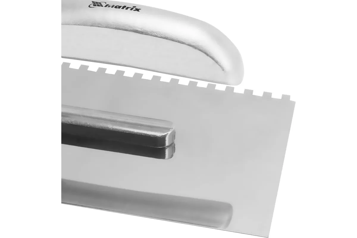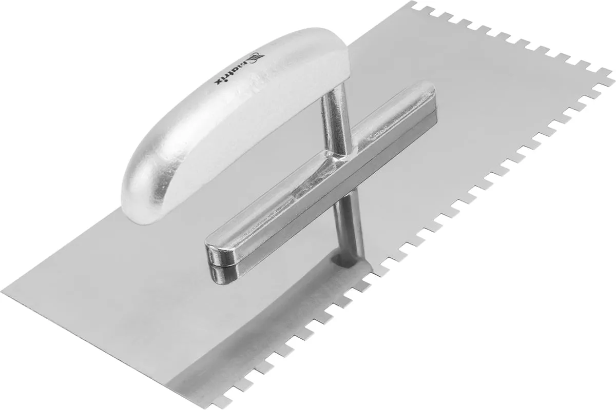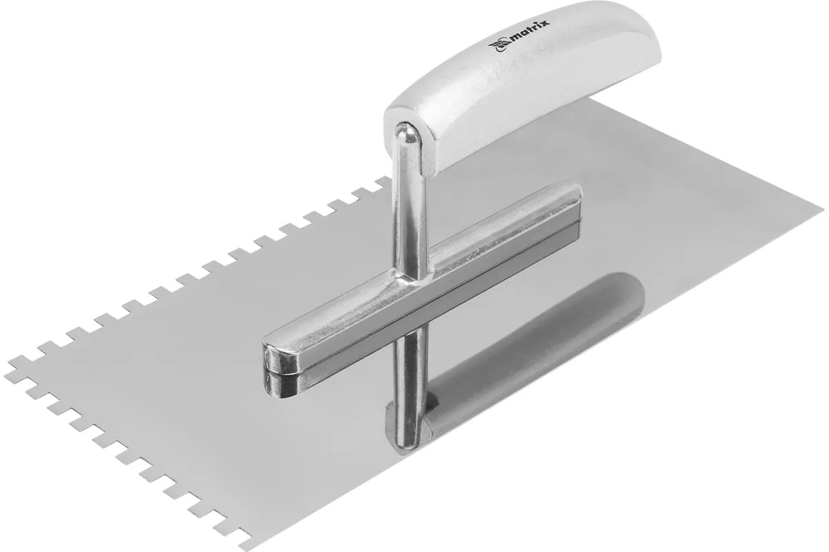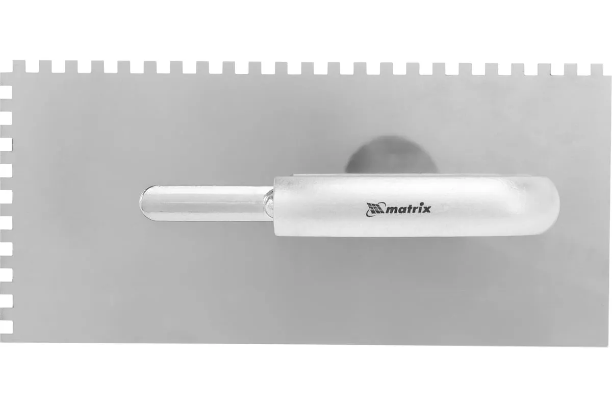 Гладилка из нержавеющей стали MATRIX MASTER 86737 - инструмент, полотно которого изготовлено из нержавеющей стали и отполировано. Ручка деревянная. Рабочая поверхность инструмента имеет квадратные зубья. Предназначена для нанесения и распределения по поверхности штукатурных смесей и клеевых составов.