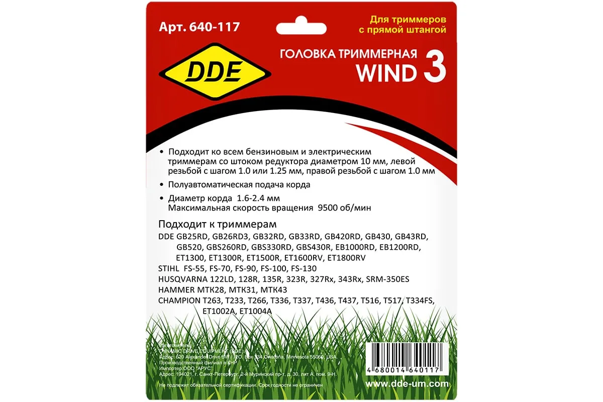 Головка триммерная WIND 3 DDE 640-117 применяется для срезания травы с помощью триммера с вращением режущей гарнитуры против часовой стрелки и прямым валом. Головка является полуавтоматической, что упрощает подачу корда. Для этого достаточно лишь слегка ударить расположенной по центру головки кнопкой о землю. В комплекте имеется адаптер для крепления головки с помощью резьбы М10х1.0 мм LH.