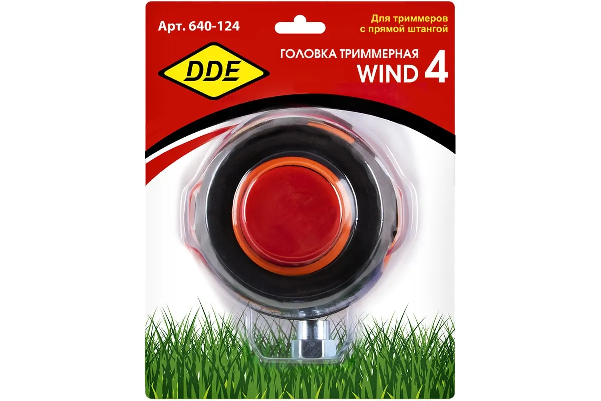 Головка триммерная WIND 4 DDE 640-124 применяется для срезания травы с помощью триммера с вращением режущей гарнитуры против часовой стрелки и прямым валом. Головка является полуавтоматической, что упрощает подачу корда. Для этого достаточно лишь слегка ударить расположенной по центру головки кнопкой о землю. В комплекте имеется адаптер для крепления головки с помощью резьбы М10х1.0 мм LH.