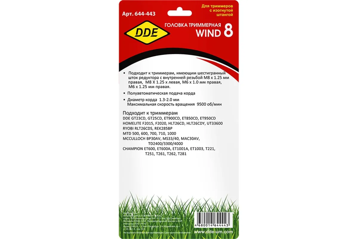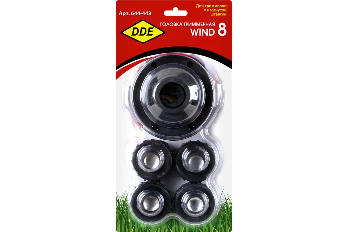 Головка триммерная WIND 8 DDE 644-443 применяется для срезания травы с помощью триммера с вращением режущей гарнитуры по часовой стрелке и валом с выступающим шестигранником 16 мм и с внутренней резьбой. Головка является полуавтоматической, что упрощает подачу корда. Для этого достаточно лишь слегка ударить расположенной по центру головки кнопкой о землю. В комплекте имеются адаптеры для крепления головки с помощью резьбы М6х1.0 мм RH и М6х1.25 мм RH.