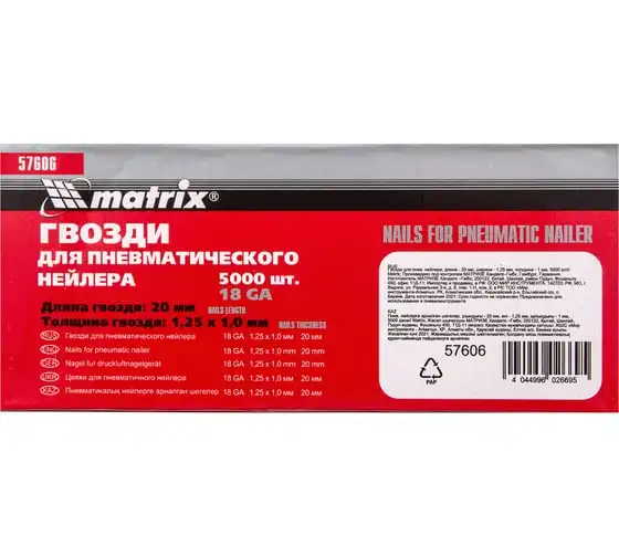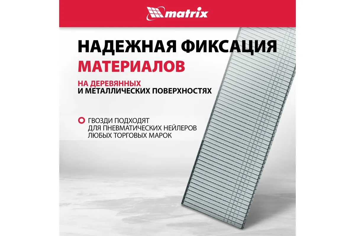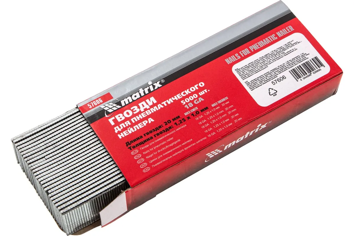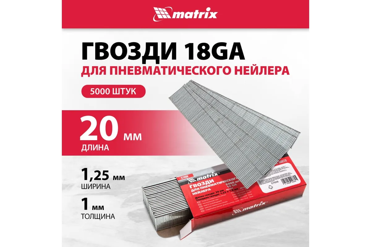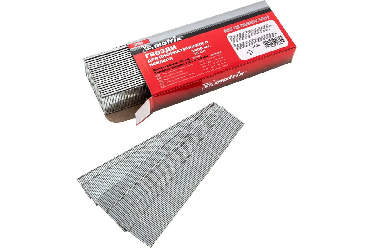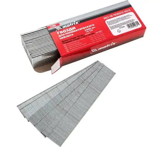 Гвозди Matrix 57606, тип 18GA, предназначены для работы с пневматическим нейлером любой торговой марки. Длина 20 мм и ширина 1,25 мм обеспечивают быстрое и надежное скрепление деревянных деталей, монтаж уголков, металлических полос и выполнение других бытовых задач.