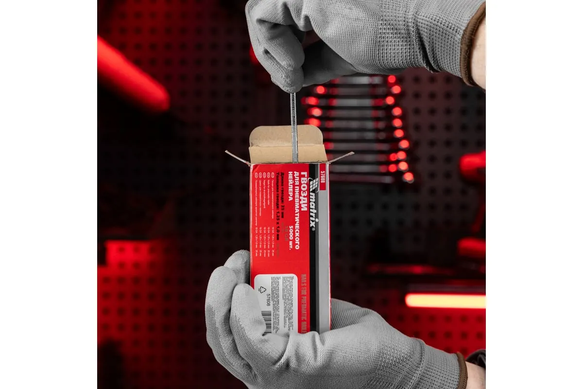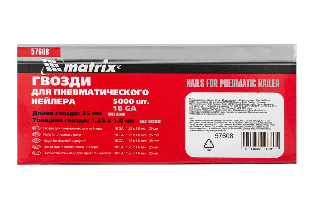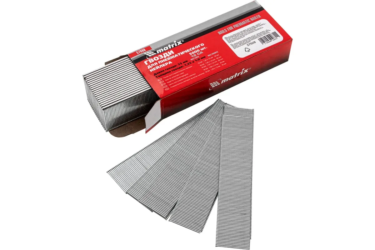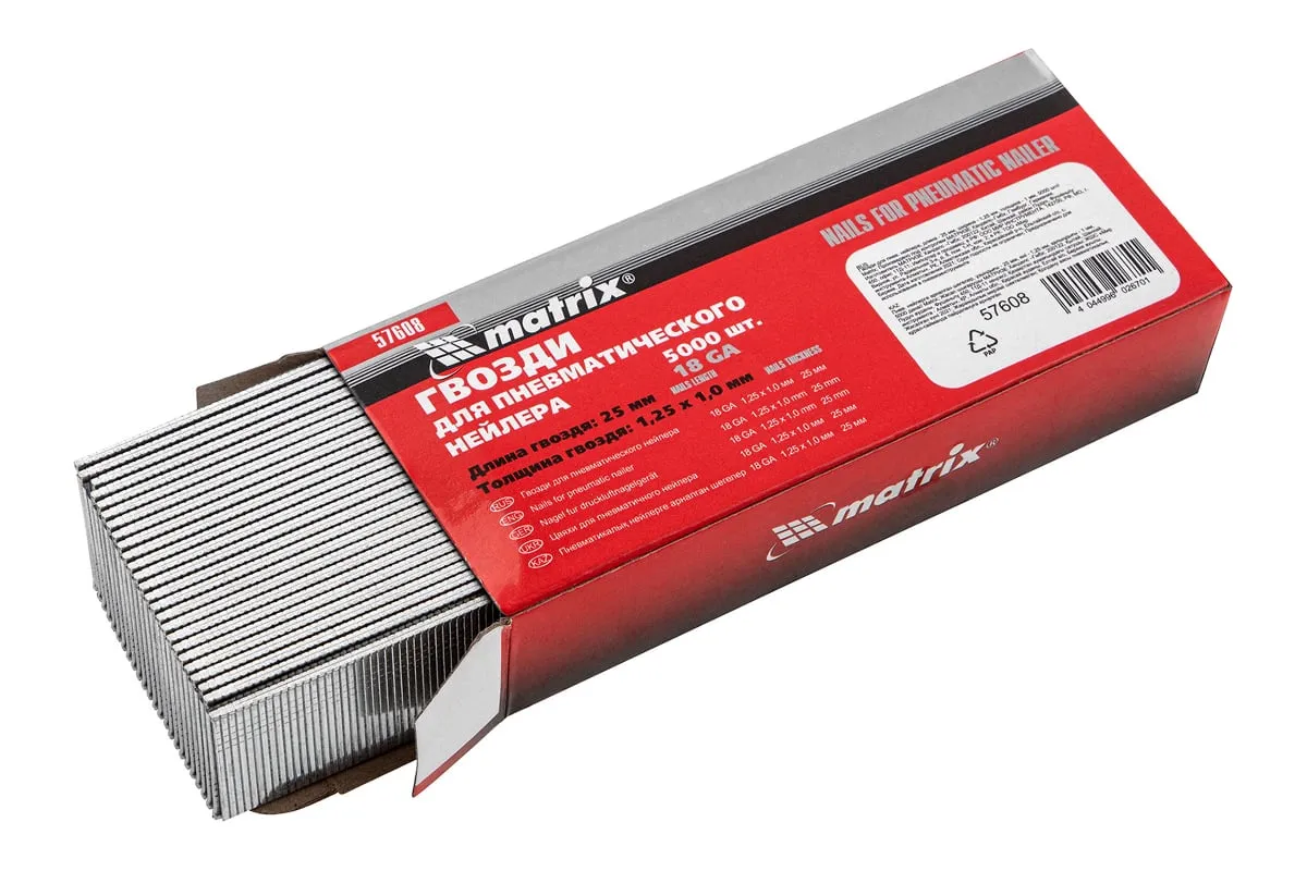 Гвозди Matrix 57608, тип 18 GA подходят к любым пневматическим нейлерам, работающим с оснасткой размером 25 х 1,25 х 1 мм. Позволяют без усилий соединять деревянные и металлические поверхности, проводить ремонтные и строительные работы.