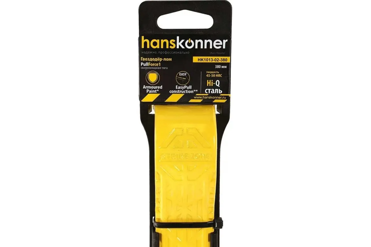 Гвоздодер Hanskonner HK1013-02-380 представляет собой качественный ручной инструмент для демонтажа различных конструкций и механизмов, а также для извлечения гвоздей. Твердость рабочих кромок 45-50 HRC обеспечивает их повышенную стойкость к деформациям. Запатентованная конструкция EasyPull construction обеспечивает лёгкое извлечение гвоздей. Специальное покрытие ArmouredPaint (бронированная краска) защищает инструмент от коррозии и внешнего воздействия.