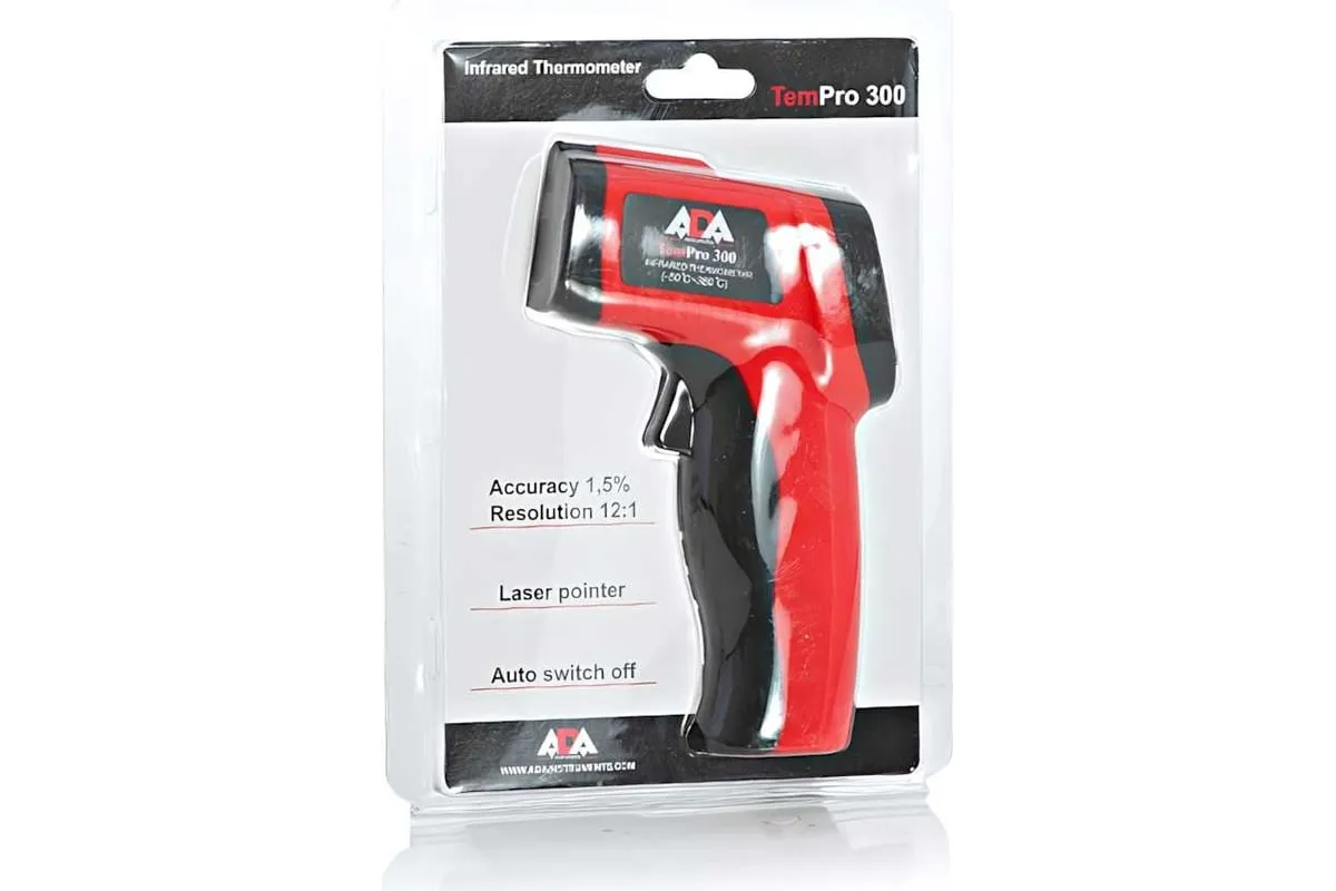 Инфракрасный пирометр ADA TemPro 300 А00222 предназначен для измерения температуры бесконтактным путем, с помощью наведения точечного лазера на объект. Данная модель измеряет диапазон температуры до 350 градусов. Пистолетная форма инструмента удобна в применении.