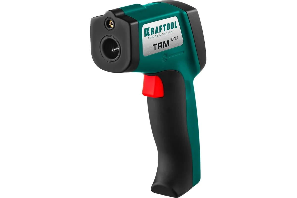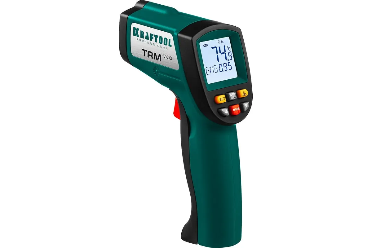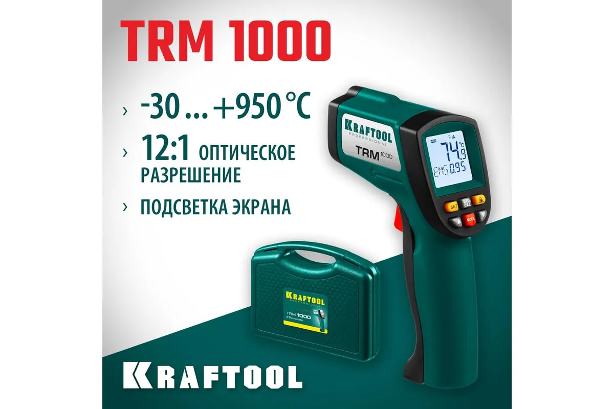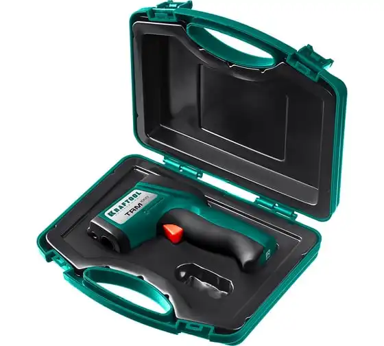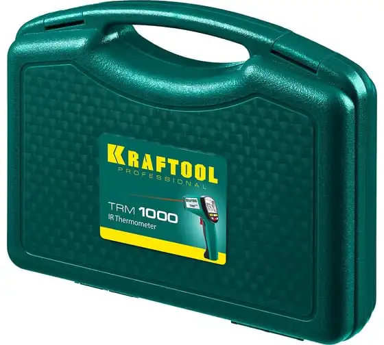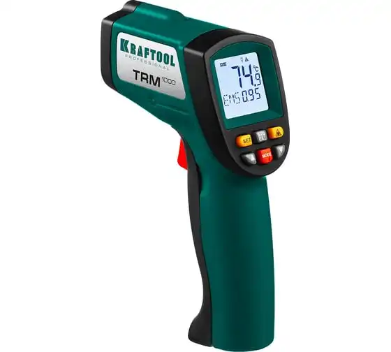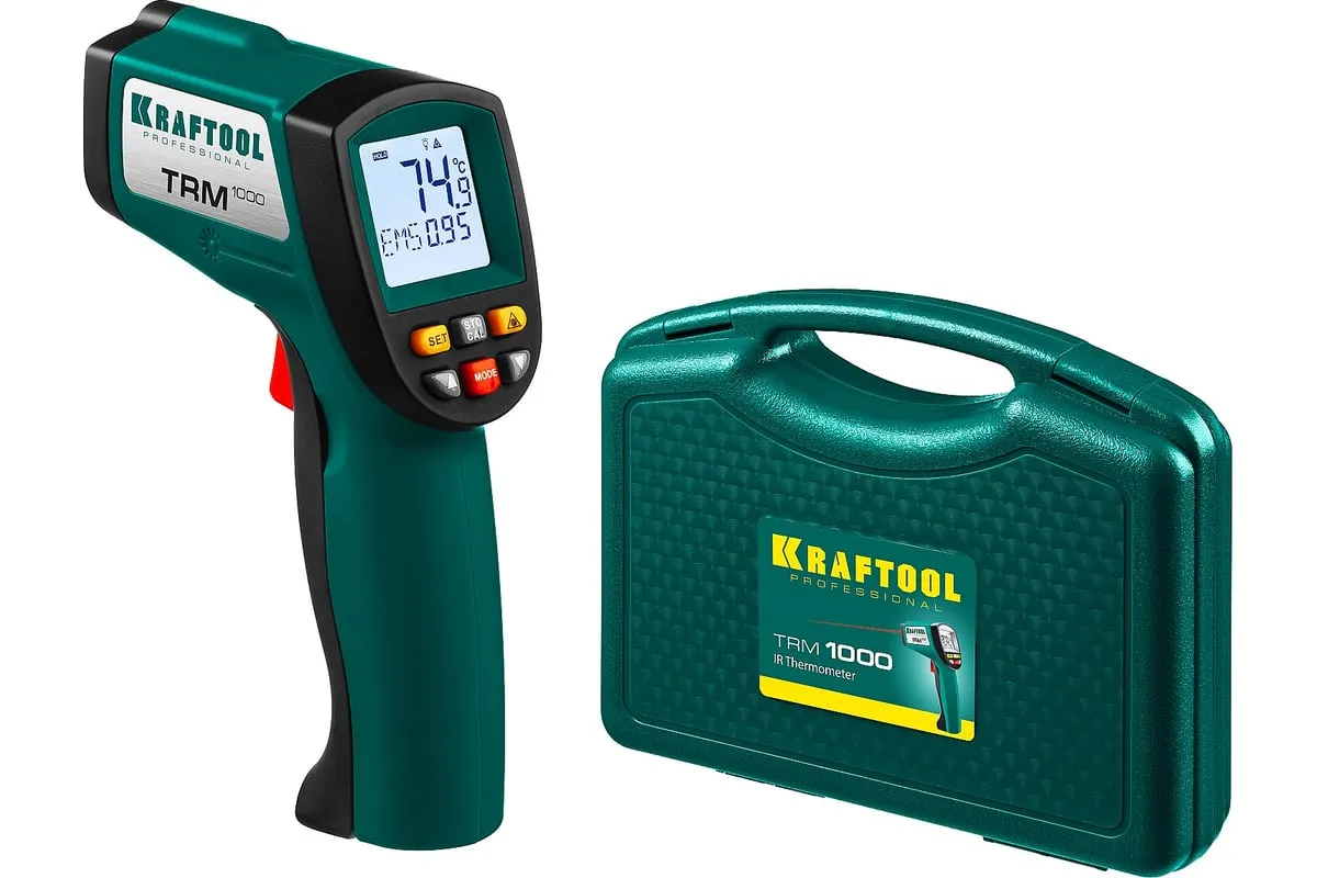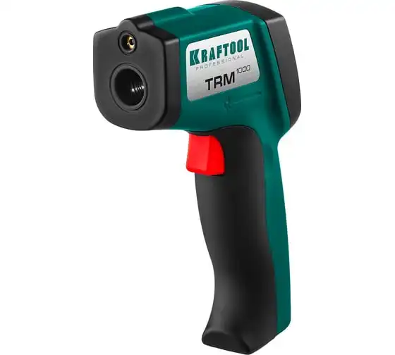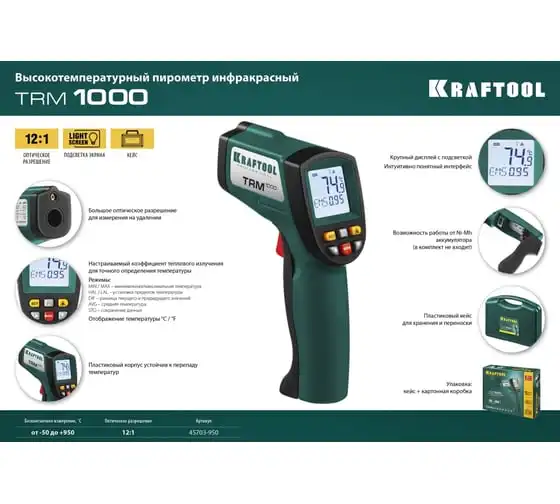 Инфракрасный пирометр KRAFTOOL TRM-1000 45703-950 обеспечивает бесконтактное измерение температуры с высокой точностью. Большое оптическое разрешение позволяет производить измерения на удалении. Корпус пистолетной формы судобным куркоми наведением точечного целеуказателя на объект. Погрешность ± 3°С (от -50°С до 0°С) ± 1,5°С (от 0°С до 950°С) Внимание! Прибор не подходит для измерения температуры тела человека. Портативные пирометры работают по принципу приема теплового инфракрасного излучения от объекта. В зависимости от длины волн они определяют температуру объекта с высокой точностью. У каждой модели есть цифровой электронный дисплей, куда выводятся результаты измерений и другая информация. Для точного измерения приборы оснащены оптическим или лазерным прицелом. Принцип действия пирометров базируется на том, что все материальные тела излучают электромагнитную энергию, а интенсивность и спектр излучения этой энергии напрямую зависит от их температуры. Пирометры определяют характеристики электромагнитного излучения и на их основании автоматически вычисляют, до какой температуры нагрет объект измерения.