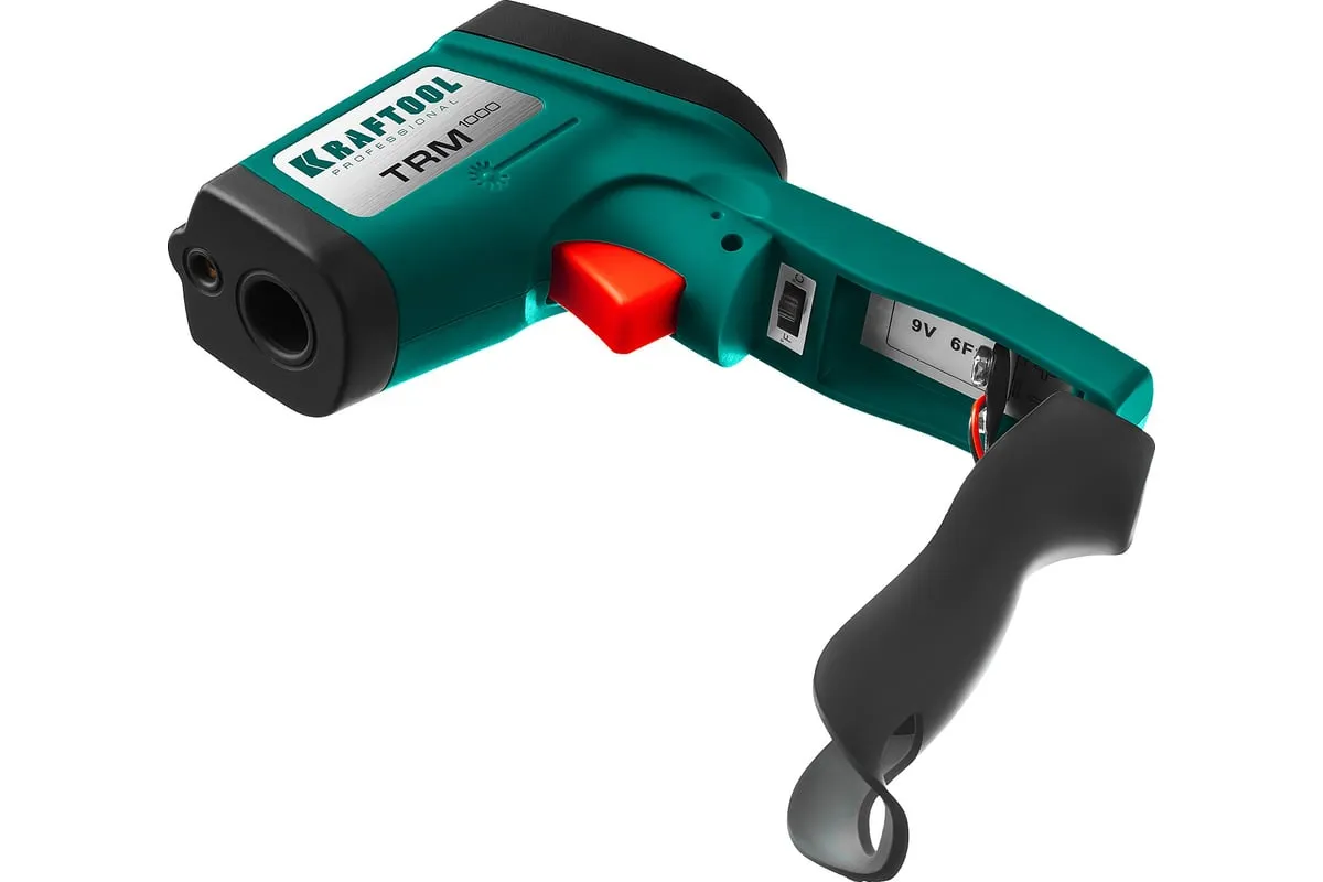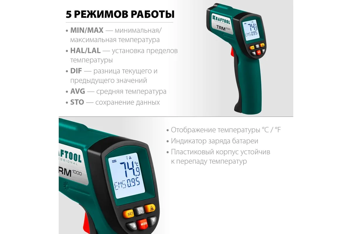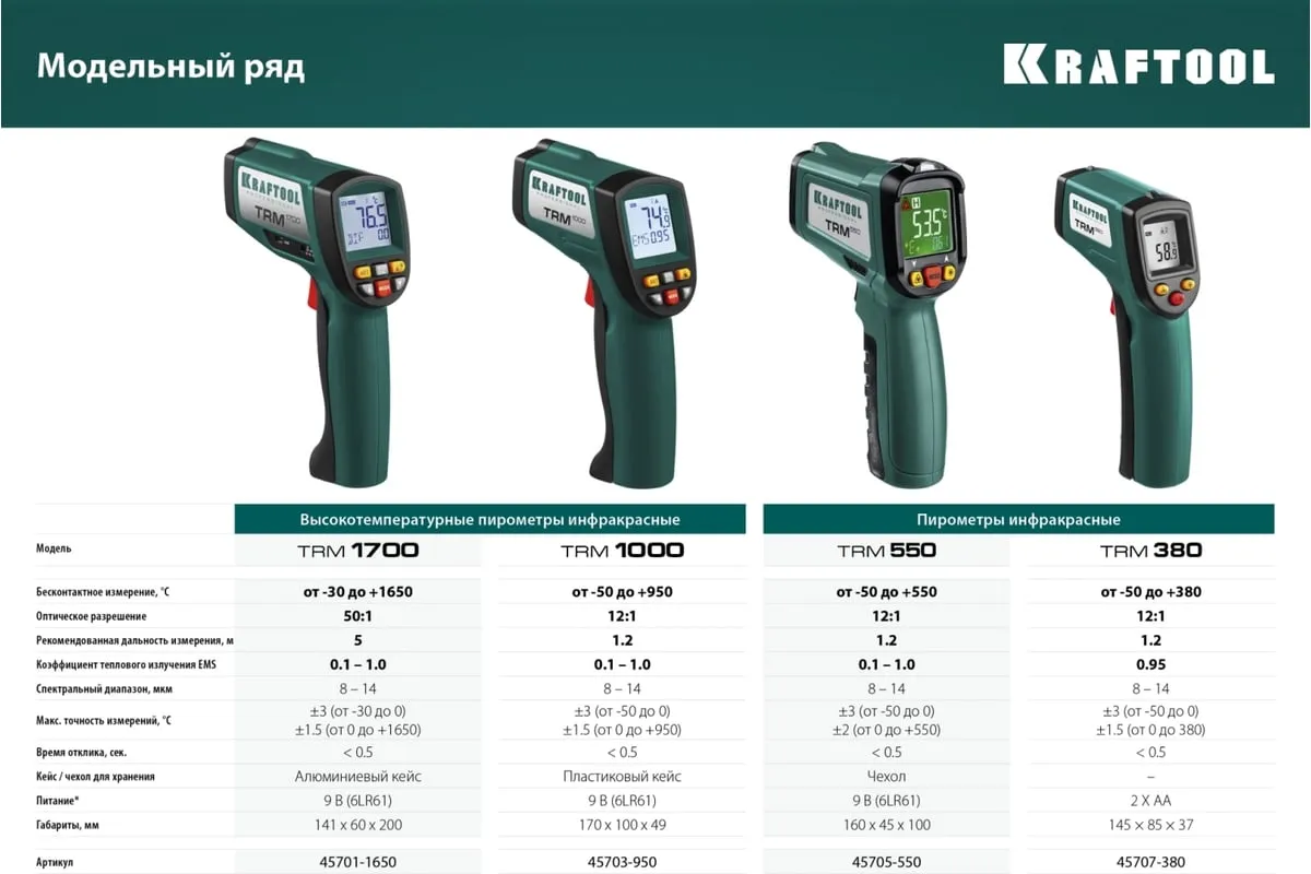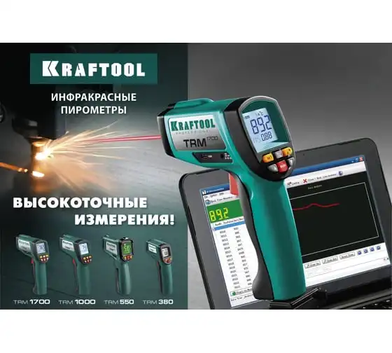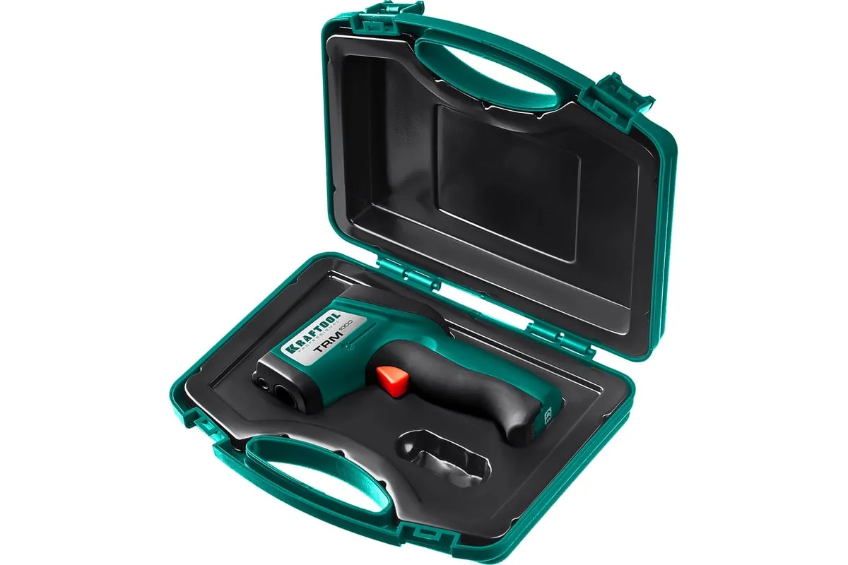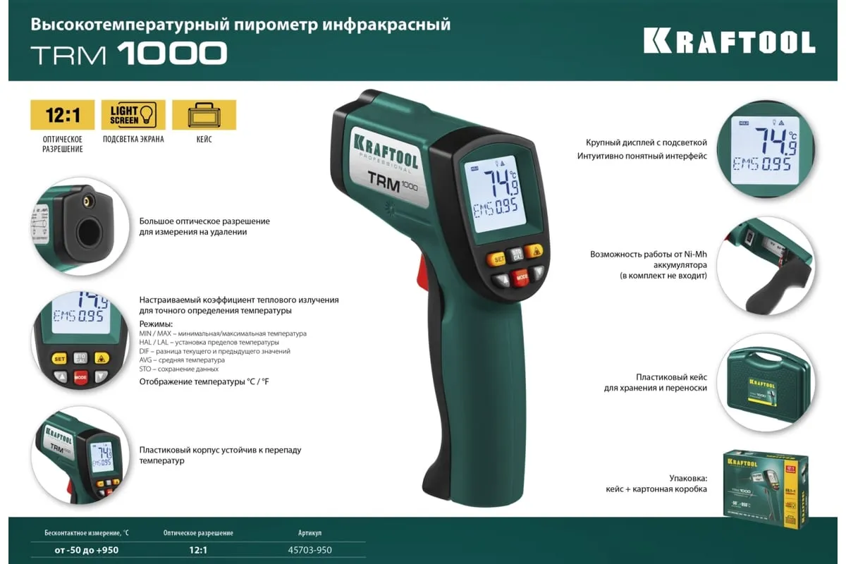 Инфракрасный пирометр KRAFTOOL TRM-1000 45703-950 обеспечивает бесконтактное измерение температуры с высокой точностью. Большое оптическое разрешение позволяет производить измерения на удалении. Корпус пистолетной формы судобным куркоми наведением точечного целеуказателя на объект. Погрешность ± 3°С (от -50°С до 0°С) ± 1,5°С (от 0°С до 950°С) Внимание! Прибор не подходит для измерения температуры тела человека. Портативные пирометры работают по принципу приема теплового инфракрасного излучения от объекта. В зависимости от длины волн они определяют температуру объекта с высокой точностью. У каждой модели есть цифровой электронный дисплей, куда выводятся результаты измерений и другая информация. Для точного измерения приборы оснащены оптическим или лазерным прицелом. Принцип действия пирометров базируется на том, что все материальные тела излучают электромагнитную энергию, а интенсивность и спектр излучения этой энергии напрямую зависит от их температуры. Пирометры определяют характеристики электромагнитного излучения и на их основании автоматически вычисляют, до какой температуры нагрет объект измерения.