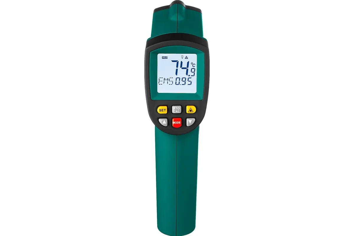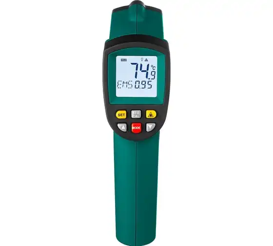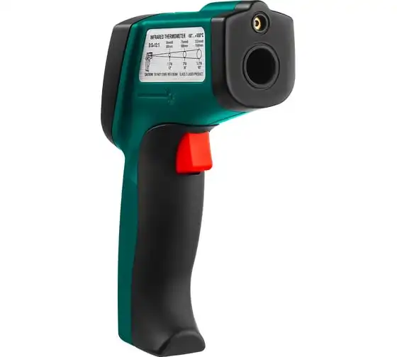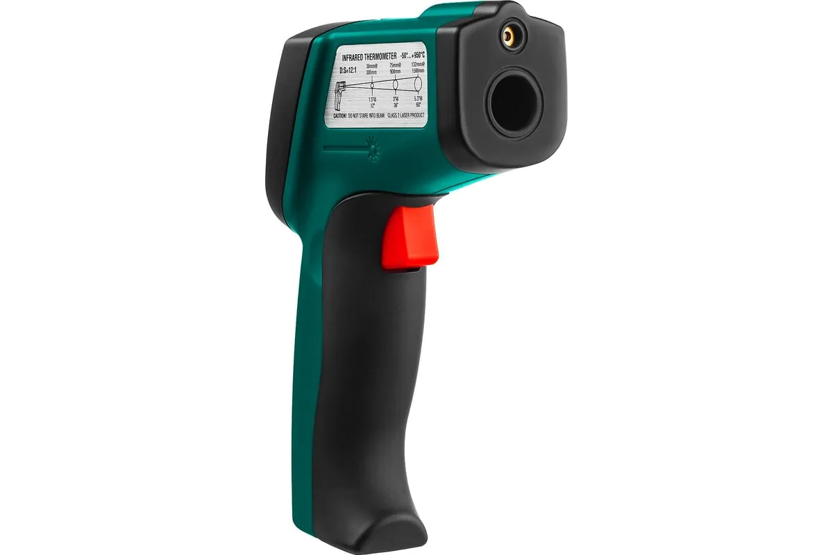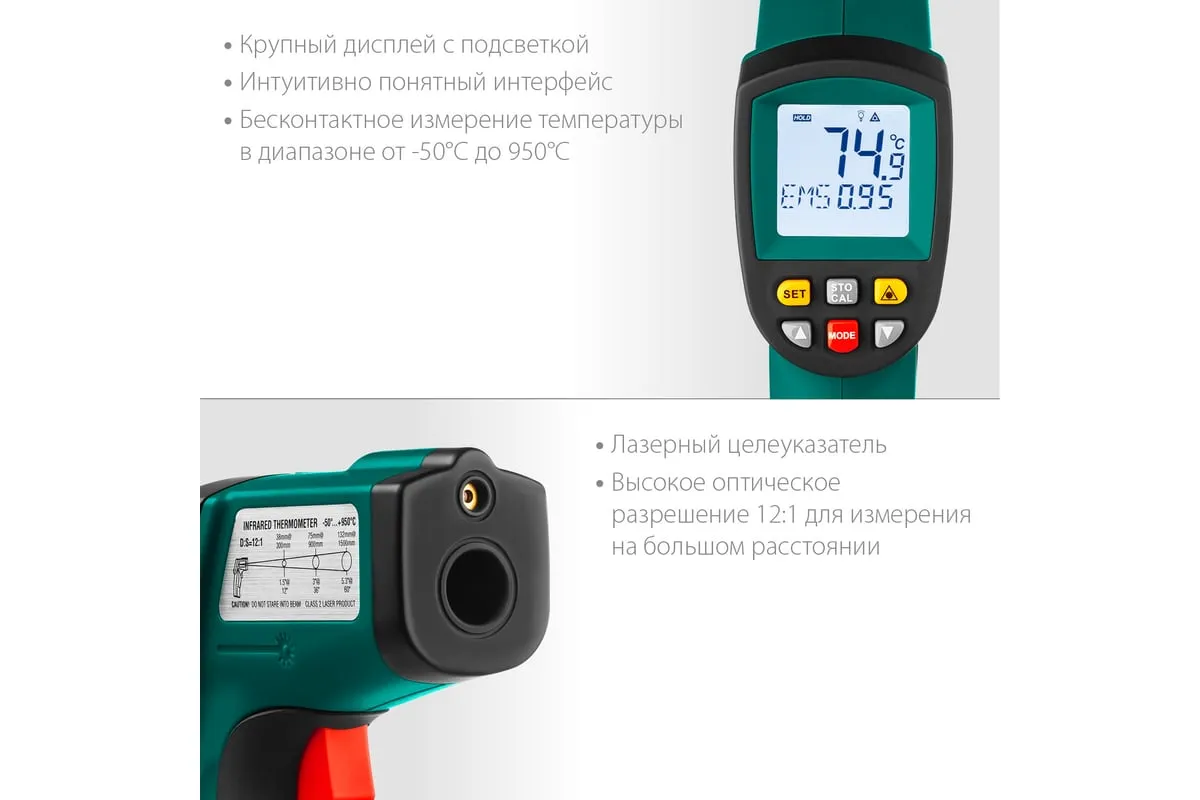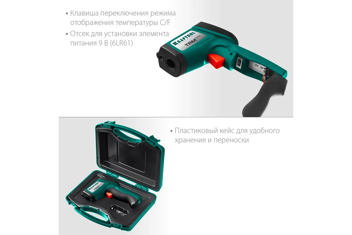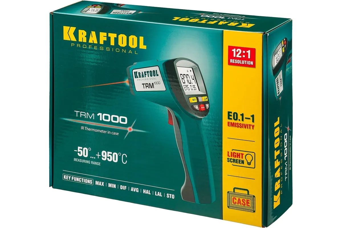 Инфракрасный пирометр KRAFTOOL TRM-1000 45703-950 обеспечивает бесконтактное измерение температуры с высокой точностью. Большое оптическое разрешение позволяет производить измерения на удалении. Корпус пистолетной формы судобным куркоми наведением точечного целеуказателя на объект. Погрешность ± 3°С (от -50°С до 0°С) ± 1,5°С (от 0°С до 950°С) Внимание! Прибор не подходит для измерения температуры тела человека. Портативные пирометры работают по принципу приема теплового инфракрасного излучения от объекта. В зависимости от длины волн они определяют температуру объекта с высокой точностью. У каждой модели есть цифровой электронный дисплей, куда выводятся результаты измерений и другая информация. Для точного измерения приборы оснащены оптическим или лазерным прицелом. Принцип действия пирометров базируется на том, что все материальные тела излучают электромагнитную энергию, а интенсивность и спектр излучения этой энергии напрямую зависит от их температуры. Пирометры определяют характеристики электромагнитного излучения и на их основании автоматически вычисляют, до какой температуры нагрет объект измерения.