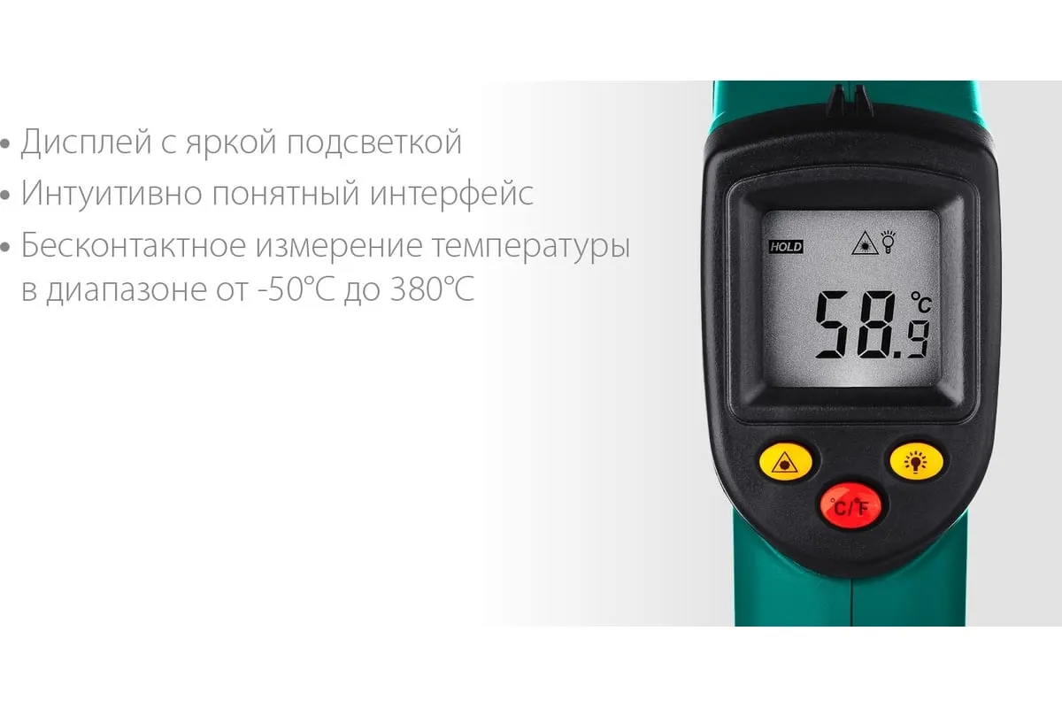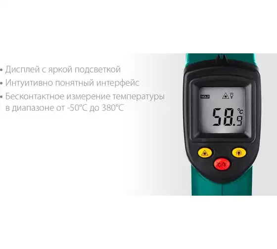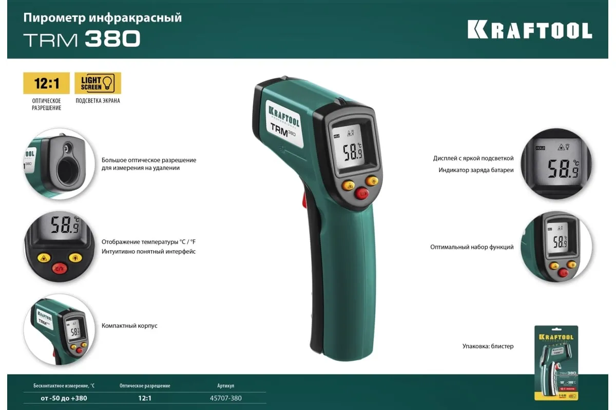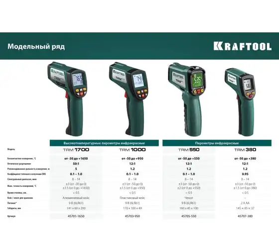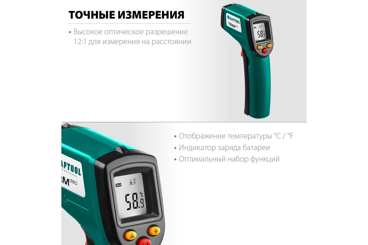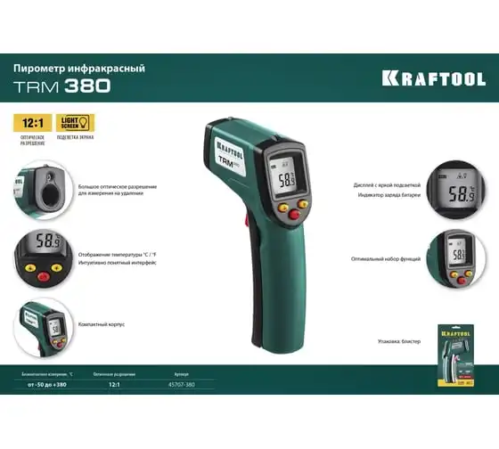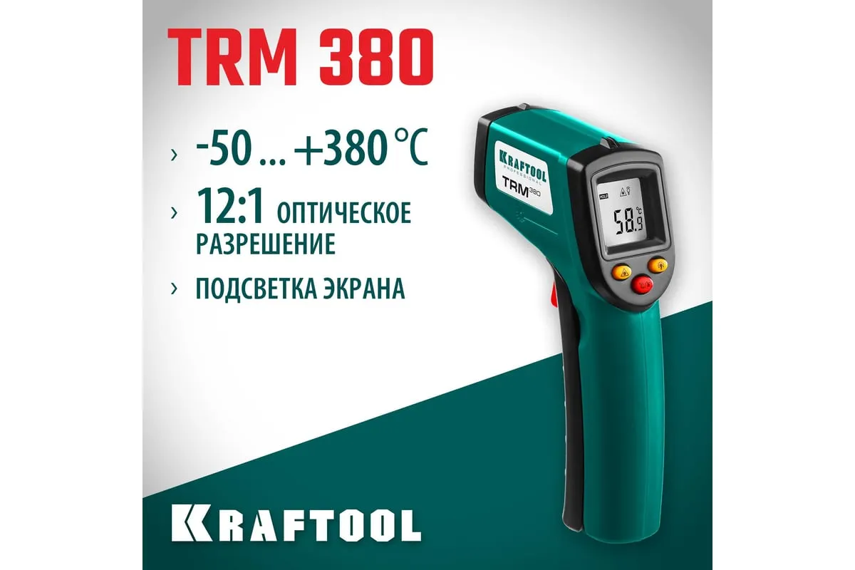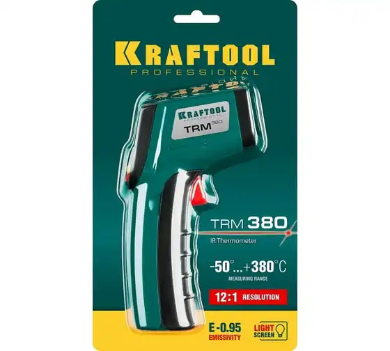 Инфракрасный пирометр KRAFTOOL TRM-380 45707-380 обеспечивает бесконтактное измерение температуры с высокой точностью. Корпус пистолетной формыимеет удобный курок. Большое оптическое разрешение позволяет производить измерения на удалении. Внимание!Прибор не подходит для измерения температуры тела человека.