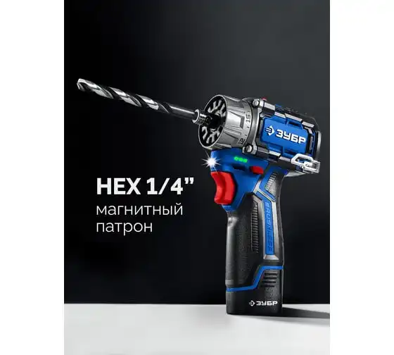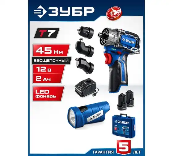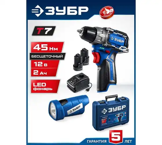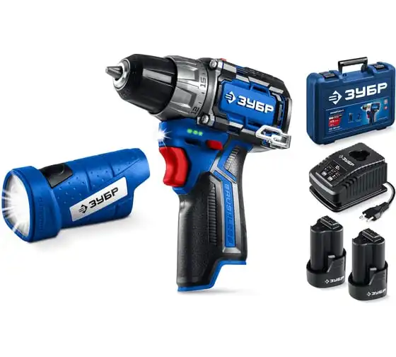 Компакт набор ЗУБР Профессионал дрель-шуруповерт + LED фонарь, 12В, 45Нм, 2 аккумулятора, тип Т7, 2Ач, кейс DB-121-22F