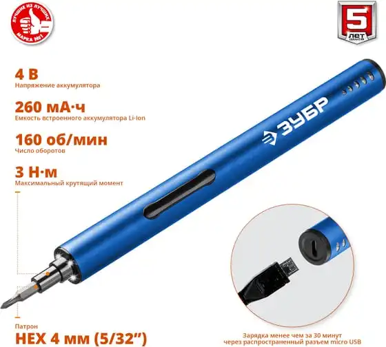 Аккумуляторная отвертка ЗУБР ViX 3.6 В ЗО-Е-3.6 Ли