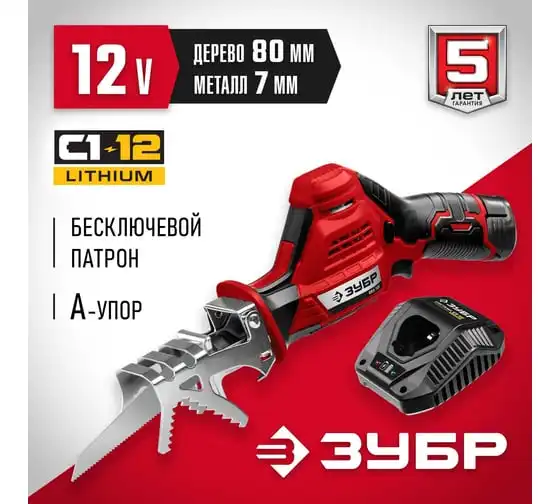 Сабельная пила ЗУБР С12В, 1 АКБ 2 Ач, в коробке СПЛ-125-21
