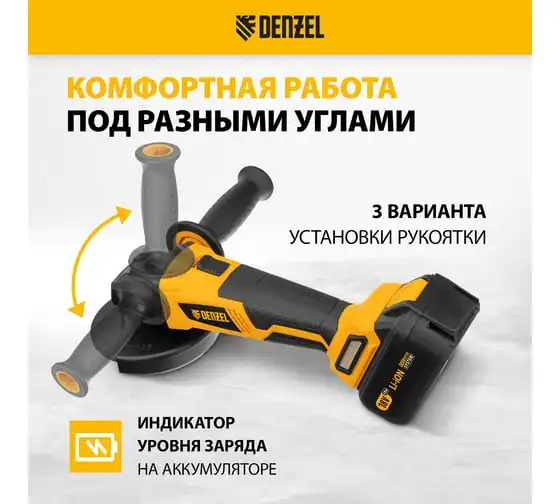 Машина шлифовальная угловая аккумуляторная Denzel бесщеточная AGH-BL-20-125, Li-Ion, 20 В 27010