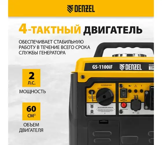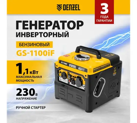 Генератор инверторный Denzel GS-1100iF, 1,1 кВт, 230 В, ручной старт 94706