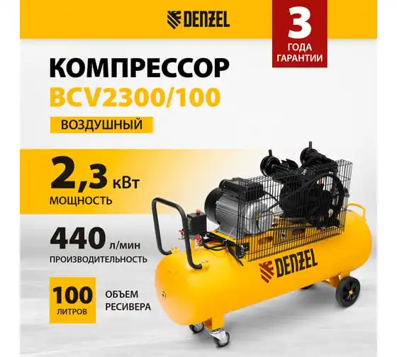 Воздушный компрессор с ременным приводом DENZEL BCV2300/100 2.3 кВт, 100 литров, 440 л/мин 58111