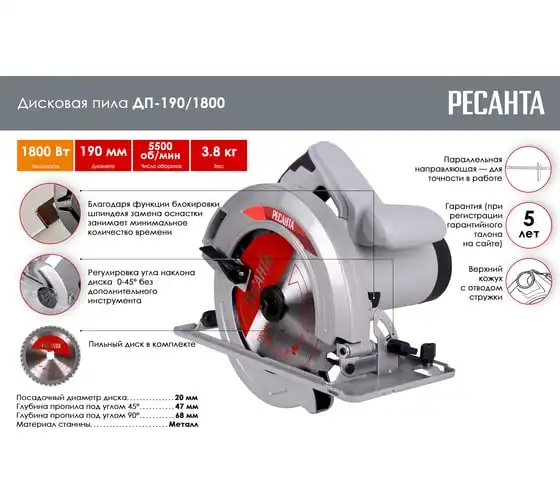 Дисковая пила Ресанта ДП-190/1800 75/11/2