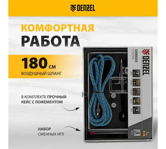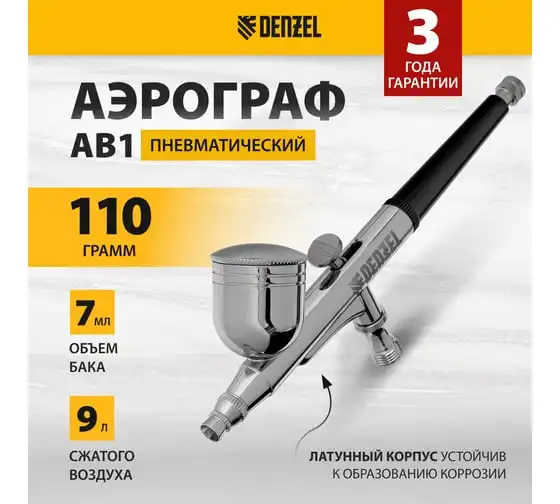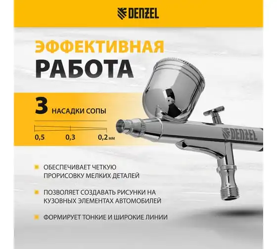 Аэрограф с верхним бачком Denzel ab1, 0.2/0.3/0.5 мм, 7 мл, 9 л/мин 57313