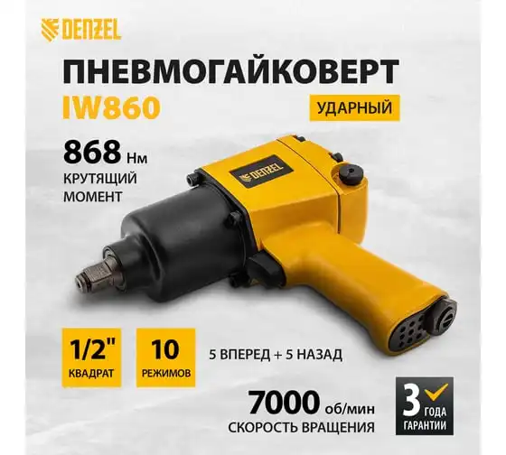 Ударный пневмогайковерт Denzel IW860 1/2, 7000 об/мин, 868 Нм 57472