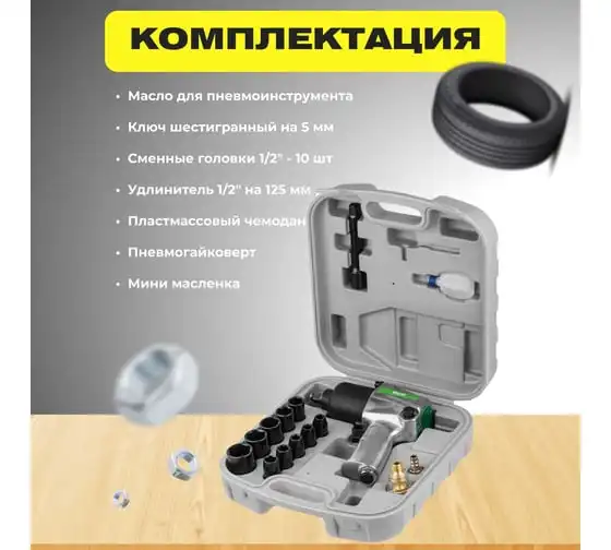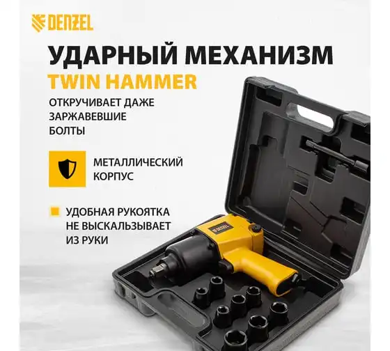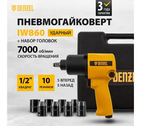 Ударный пневмогайковерт Denzel IW860 набор головок 1/2, 7000 об/мин, 868 Нм 57473