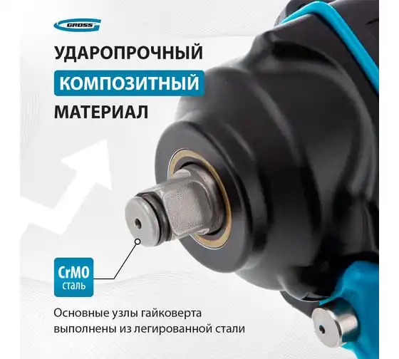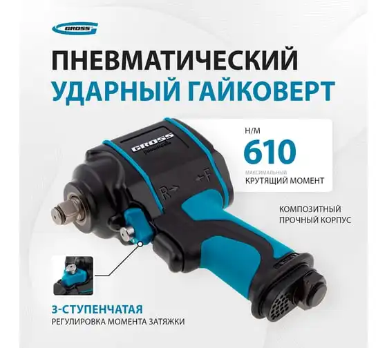 Гайковёрт пневматический ударный GROSS G985, 1/2",Twin Hammer, 610 Нм, 9000 об/мин, композитный 57440