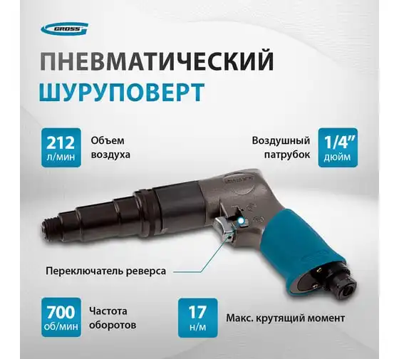 Шуруповерт пневматический GROSS G208, 1/4", 17Нм, 700 об/мин 57448