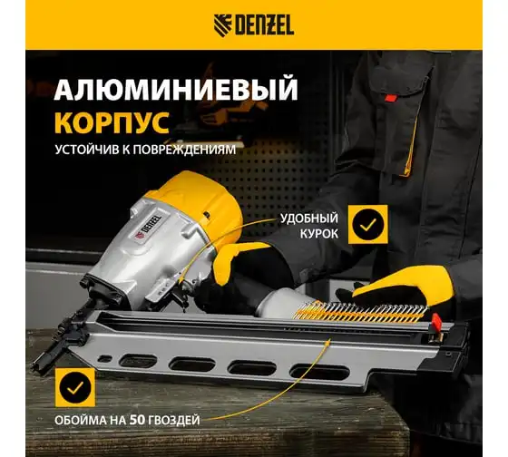 Пневматический нейлер Denzel pn2190 для гвоздей sn21 от 50 до 90 мм 57429