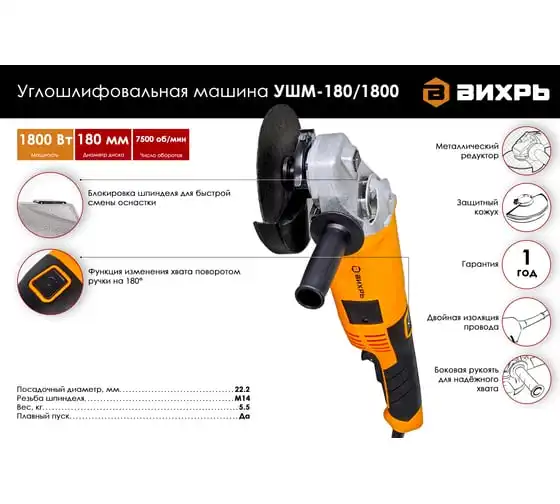 Углошлифовальная машина Вихрь УШМ-180/1800 72/12/5