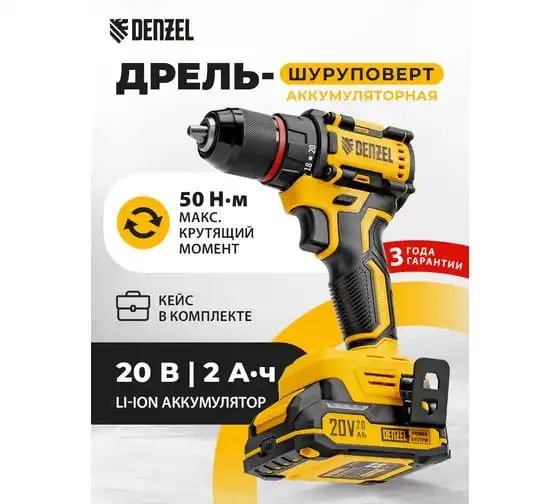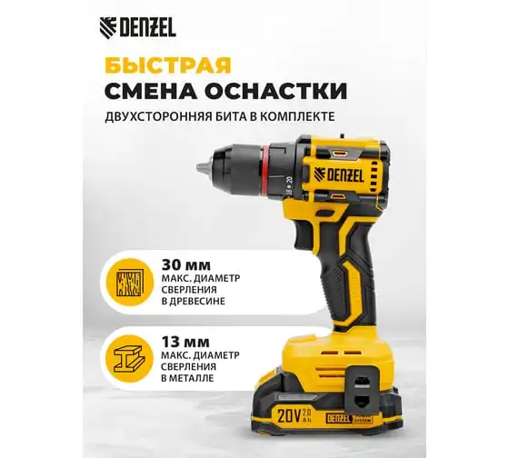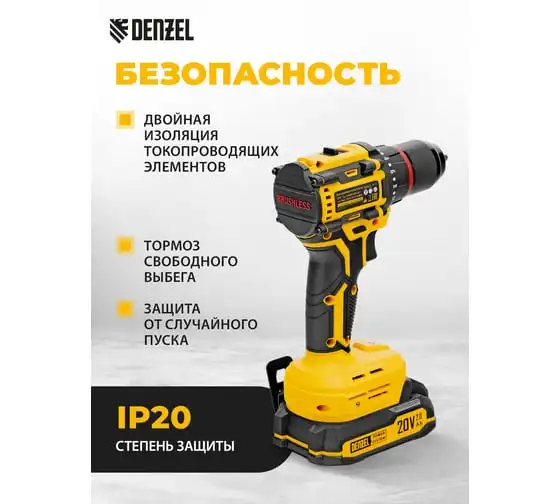 Дрель-шуруповерт аккумуляторная бесщеточная Denzel CDH-BL-20, Li-Ion, 20 В 26123