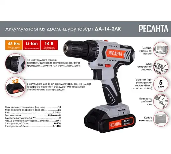 Аккумуляторная дрель-шуруповерт Ресанта ДА-14-2ЛК 75/14/4