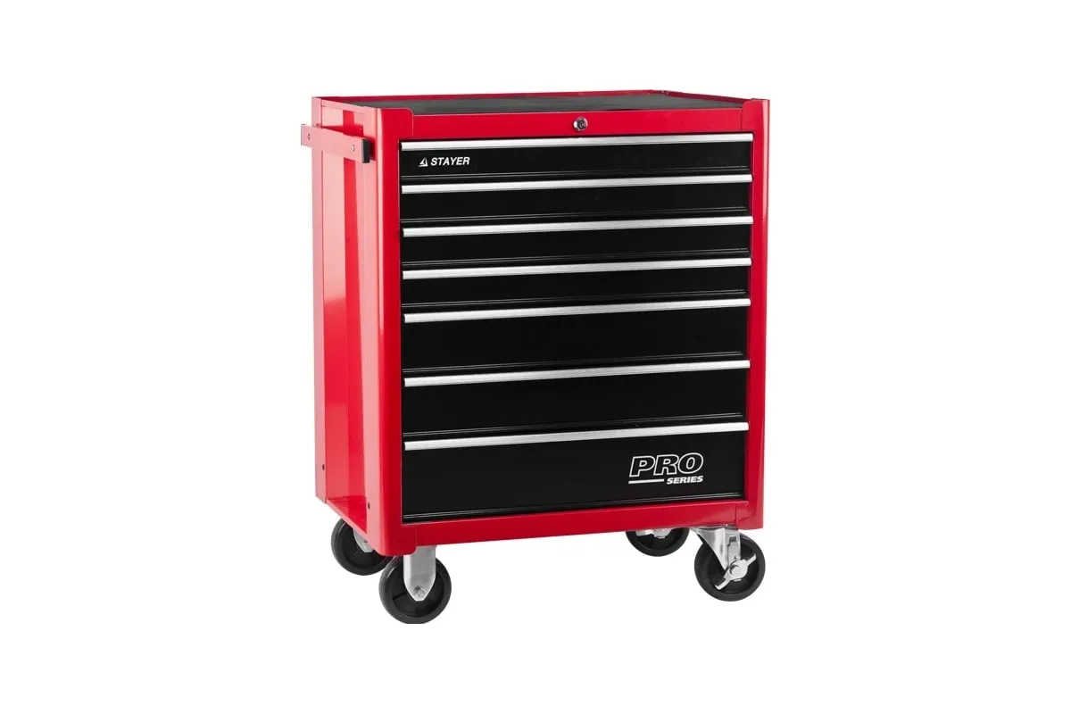 Инструментальная тележка STAYER EXPERT, 7 ящиков, 688x458x885мм 38907-7 имеет 7 выдвижных ящиков с противоскользящими ковриками внутри. В комплект входят два ключа и центральный замок. Колеса оборудованы стопорным механизмом, что предотвращает скатывание тележки.