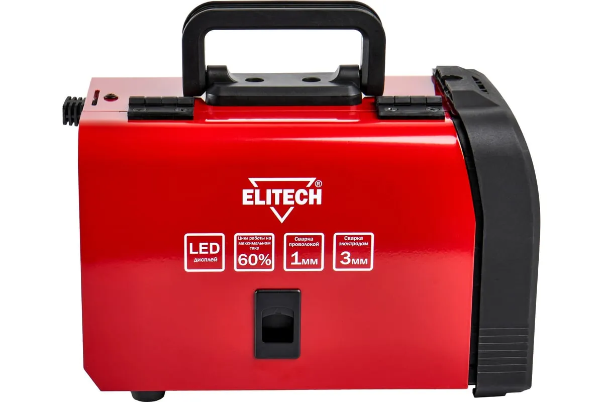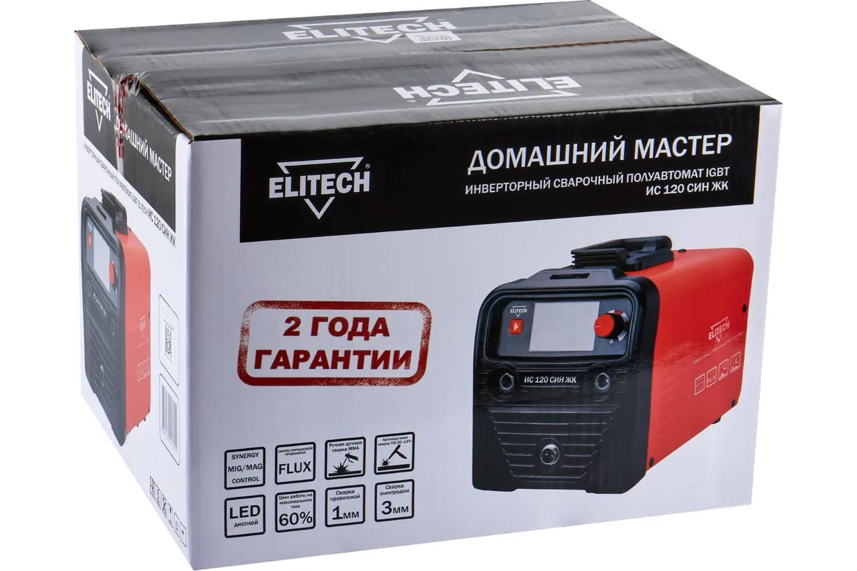Сварочный инвертор ELITECH ДМ ИС 120 СИН ЖК мощностью 3 кВт, предназначен для дуговой полуавтоматической сварки MIG/MAG плавящейся электродной порошковой проволокой (FLUX) без применения защитного газа. Аппарат также предназначен для ручной дуговой сварки (РДС) штучными плавящимися электродами MMА. И дополнительно аппарат имеет возможность аргонодуговой сварки (TIG) на постоянном токе неплавящимся вольфрамовым электродом в среде защитного инертного газа – аргона (сварка только углеродистых и нержавеющих сталей).
