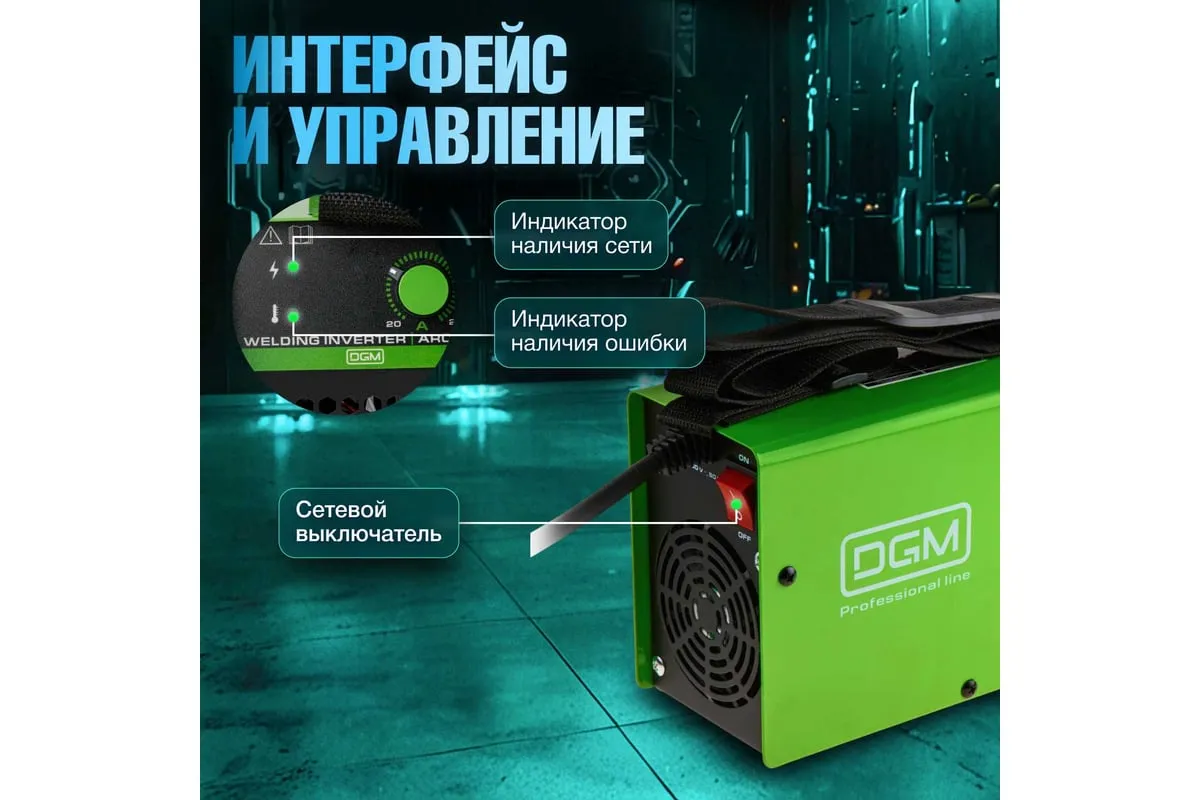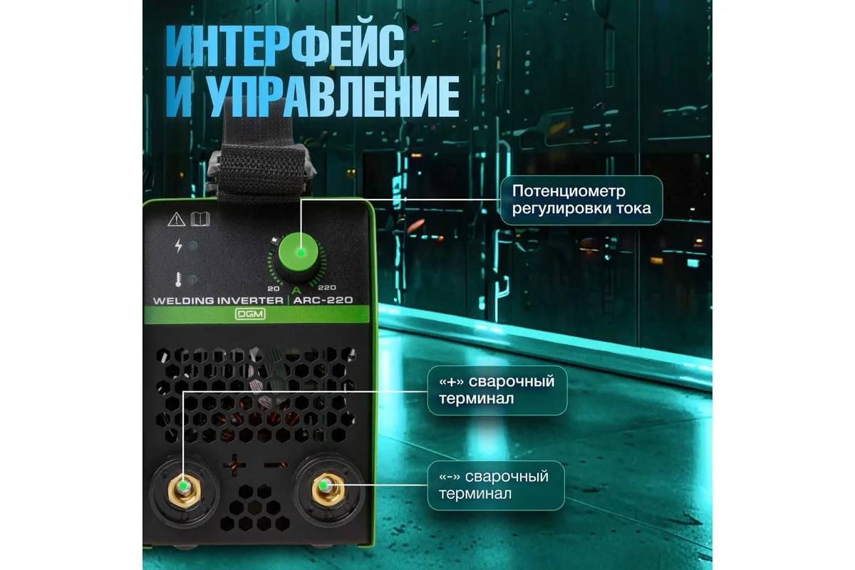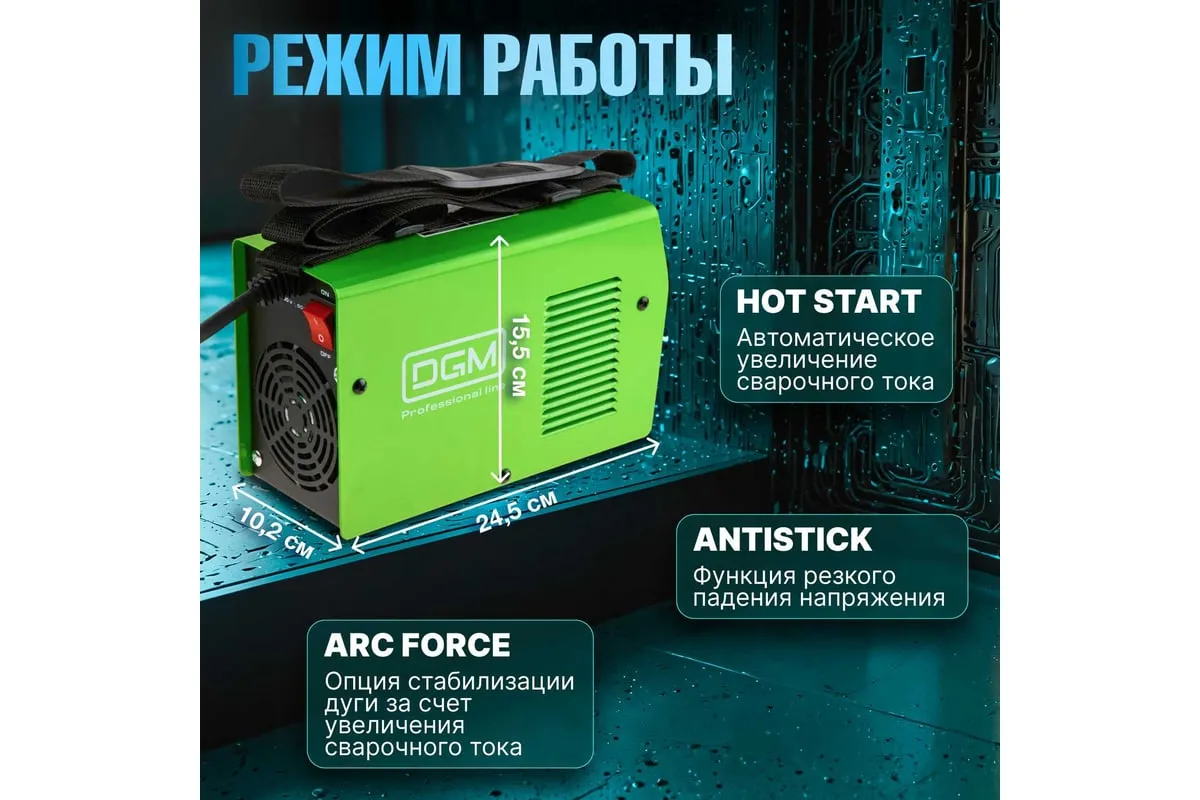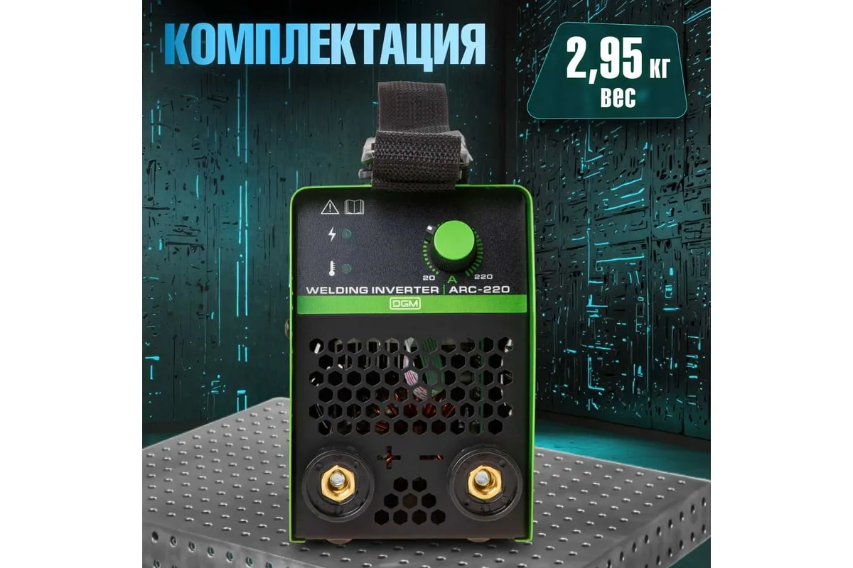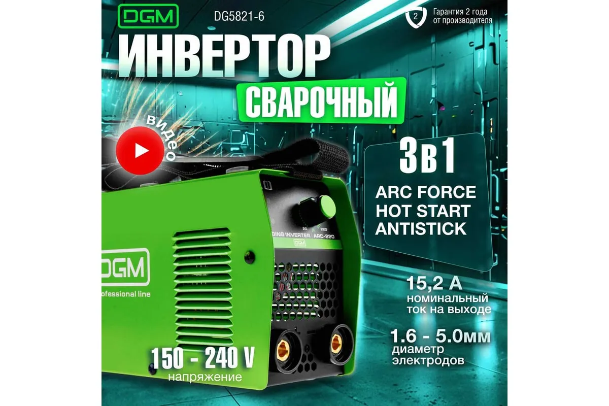 Инвертор сварочный DGM ARC-220 (DG5821-6) - это компактное устройство с IGBT-транзисторами, предназначенное для ручной дуговой сварки. Благодаря высокому напряжению холостого хода и функциям ARC FORCE, HOT START и ANTISTICK, обеспечивается уверенный поджиг дуги и стабильность сварки. Инвертор адаптирован для работы с сетями с пониженным напряжением от 150 В, оснащён транспортировочным ремнём для удобства переноски.