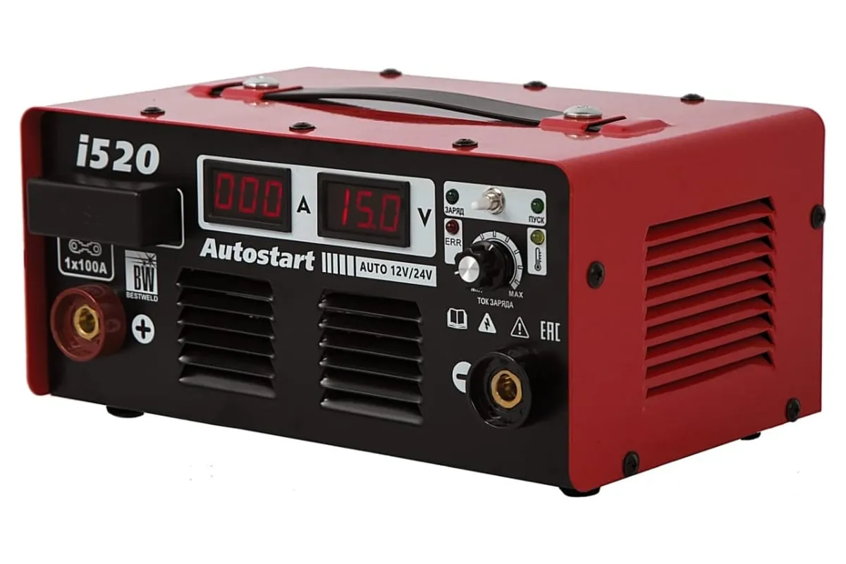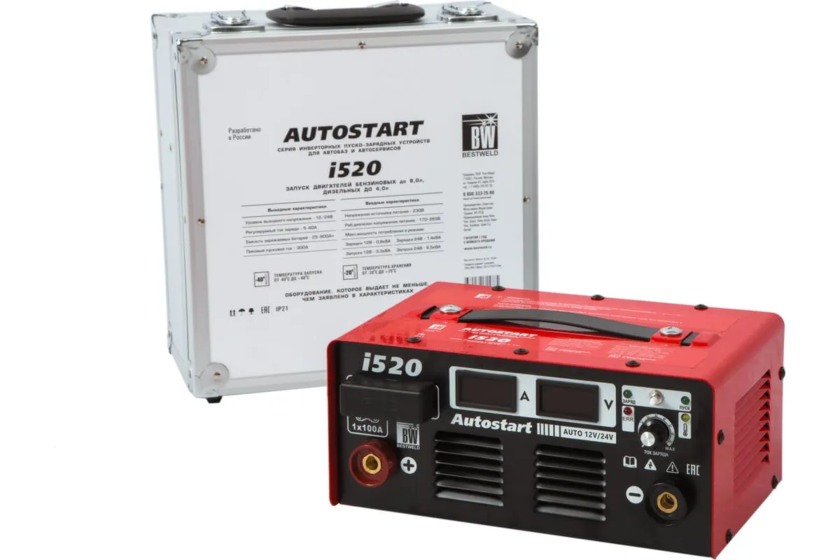 Инверторное пуско-зарядное устройство BestWeld AUTOSTART i520 BW1640 со съемными клеммами по новейшей инверторной технологии с автоматизириванным циклом зарядки. Ток заряда регулируется специальной ручкой и отображается на дисплее, что позволяет выставить точный показатель. Отдельный дисплей также показывает напряжение, которое устройство точно определяет и выбирает автоматически - 12/24 В.