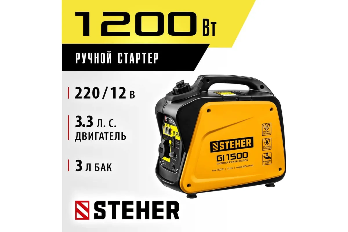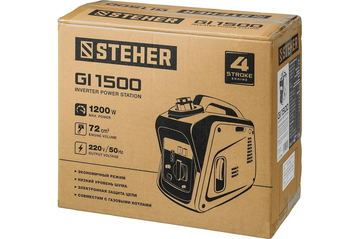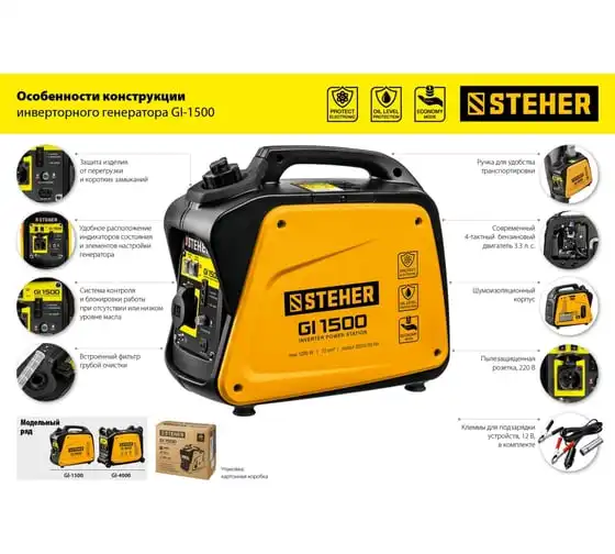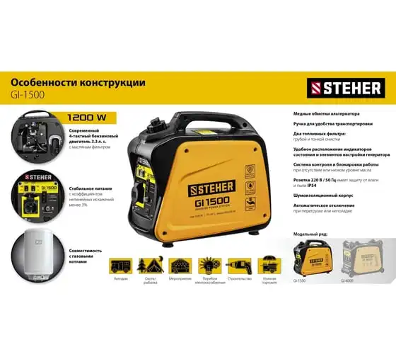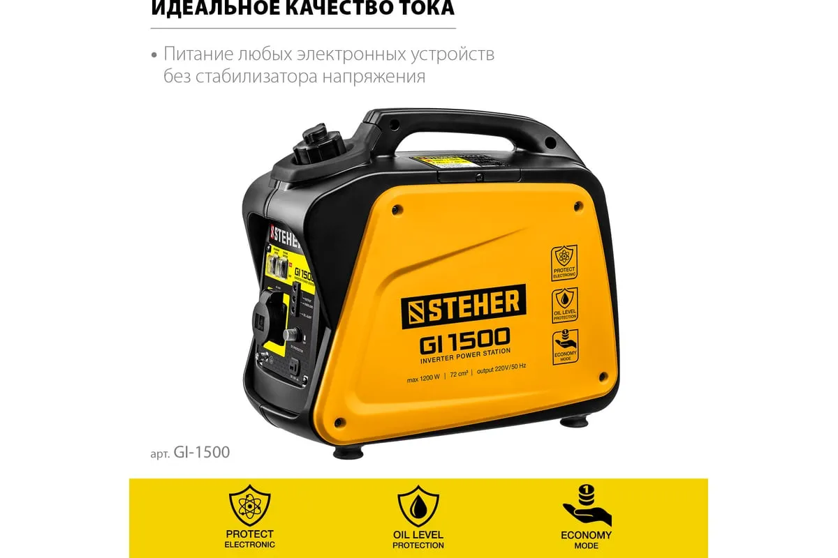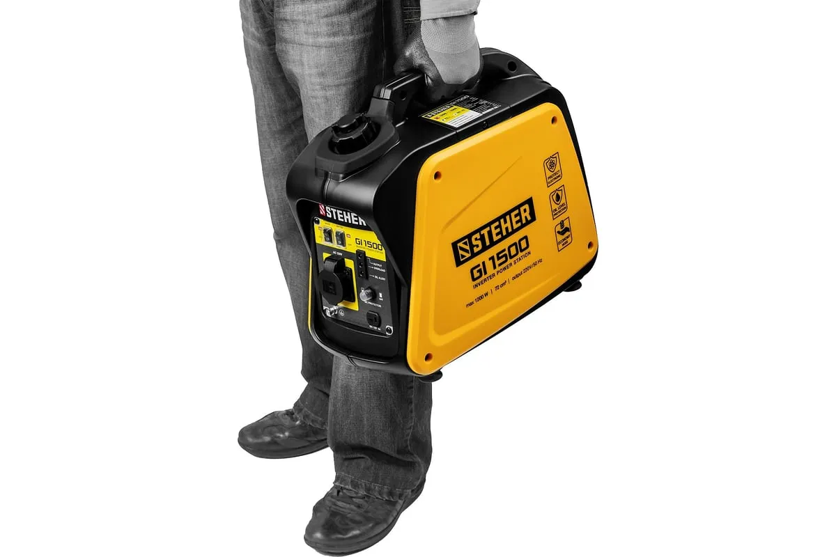 Инверторный генератор STEHER 1200 Вт GI-1500 отличается компактными размерами и небольшим весом, что позволяет использовать его в походе, в кемпинговом лагере, на рыбалке, на пляже. Модель с легкостью обеспечивает питание и зарядку гаджетов и мелкой бытовой техники. Инверторный принцип работы гарантирует идеальное качество вырабатываемой электроэнергии и позволяет использовать станцию без стабилизатора. Предусматривается дополнительный выход на 12 В для подзарядки аккумуляторов.